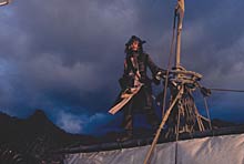 „Es geht hier nur um´s Geschäft“, sagt jener Lord Becket, der eine intime Feindschaft mit Jakob Spatzen hat, alias Jack Sparrows, wobei in der Geschichte der Grund dieser Feindschaft immer nur angedeutet wird durch das eingebrannte „P“ auf Jack Sparrow´s Unterarm, ein Schandmal, das zwischen Lord Becket und Jonny Depp steht, wobei mehr gar nicht erklärt werden braucht, weil in Wahrheit die Erotik zwischen diesen beiden schönen Männern, die so ganz verschieden sind: er der gepuderte Superbeamte im roten Livree mit weißer Perücke, wie Mozart auf den österreichischen Euro-Münzen, die bei ihm nicht lächerlich wirkt, selbst wenn dieser böse schöne Mann einmal, was er selten tut, in Rage gerät, und auf der anderen Seite der Pirat, der nur auf Frauen steht, aber absolut feminin wirkt, auf seine Weise jedoch nicht minder edel, – weil also in Wahrheit die Erotik zwischen diesen beiden Männern die Hauptrolle spielt. Die Schlüsselgeste dieser Szene, wo die beiden sich zum entscheidenden Rededuell treffen, ist die, wo Depp vor dem Spiegel mit dem Stock in der Hand die Geste des Grandsigneurs nachahmt, halb kindlich imitativ, halb ironisch. Eigentlich ein doppelter Spiegel. Er macht uns alle nach, macht mit seinen kajal-betonten Augen alle zum Deppen, Jack Sparrows. Und dieser Captain Barbossa, mit seinem Schütze-Antlitz im Schatten seines Riesen-Hutes und der vorfühlenden Freude im Gesicht! Wenn er mit jemandem spricht, ist klar, dass dieser Mann Hintergedanken hat, man ihm aber trotzdem trauen kann, weil er seine eigene Inszenierung mehr liebt, als seine Hintergedanken. In diesem Film „hät´s ganz entschiede geniaali Schuhspieler“, wie unsere Schweizer Nachbarn sagen würden.