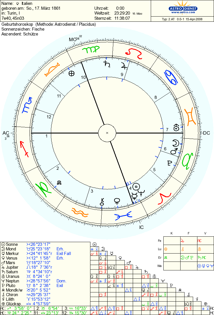 Doch es geht noch weiter! Auch Italien hat ein Horoskop. Italien ist eine Fische-Sonne Haus 4 mit einem Schütze Aszendenten. Jupiter, der regierende Planet, steht im Löwen Haus 9. Italien will also an den lieben Gott glauben. Und der Saturn steht in der Jungfrau Haus 9: da hat Silvio Berlusconi mit seinem Jungfrau AC das richtige Auftreten.