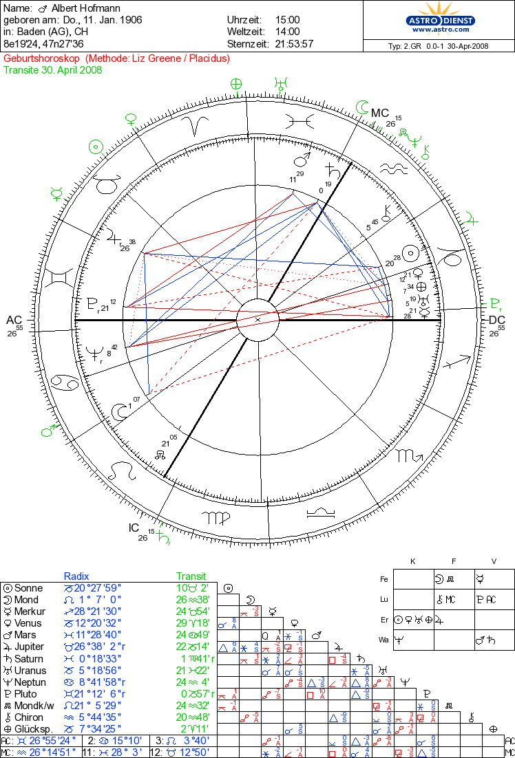 Hofmann ist am 11. Januar 1906 um 03:00 PM in Baden/Schweiz geboren worden. Schon allein sein Neptun im ersten Haus prädestiniert ihn zum Entdecker einer Rauschsubstanz. Seine Steinbock Sonne im achten Haus macht ihn zum Magier der Realität. Die Haus Position zeigt an, was er tut, die Zeichen Position mit welcher Bestimmung und Stärke. Und der Mars in den Fischen wird übersetzt mit: möchte alle Erfahrungen mitnehmen. Saturn knapp in den Fischen sagt: kann nur Strukturen vertreten, an die er auch glaubt. Natürlich ist Saturn in Haus 10 ein sehr beharrlicher Berufsweg. Sein „Sorgenkind“ LSD wurde, bevor man es verbot, von vielen Psychotherapeuten mit großem Erfolg benutzt. Der Missbrauch ist, so glaube ich, bedingt durch das Verbot. In einer Welt, wo man Pflanzen verbietet, kann man froh sein, dass Atmen erlaubt ist (wenn es die Feinstaubbelastung zuläßt). In diesem Sinne leben wir im tiefsten Mittelalter. Mit der Walpurgisnacht hat das insofern zu tun, als dass die Grundsubstanz von LSD auch in Pilzen gefunden wird, die Psilocybin als Inhaltsstoff haben. Und natürlich wurden diese Erdfrüchte in ganz Europa und Südamerika an allen möglichen Kultstätten zur Erweiterung des Bewußtseins gebraucht und verehrt. Ganze Landschafts- und Städtenamen „Mykene“ gehen auf Pilzkulturen zurück. Auch hier bei uns soll man angeblich Menschen im Frühsommer über die Wiesen wandern sehen, und den Spitzkegeligen Kahlkopf suchen. Allerdings muss man wohl auch vor Gefahren warnen, denn da gibt es bei Missbrauch sogenannte „Horrortrips“. Wer jedoch wissen will, ob Elfen und Zwerge wirklich existieren, kann das wohl mit dem Fliegenpilz, so genannt, weil er Anteil an der Flugsalbe der „Hexen“ hatte, erfahren. Doch, wie gesagt, aufgepasst! Das ist gesetzlich verboten und somit gefährlich in doppelter Hinsicht. Keineswegs will ich hier zum Gebrauch verbotener Dinge aufrufen. Auch schwere Vergiftungen kommen vor. Andererseits: Antibiotika wurden, das sei hier noch erwähnt, ursprünglich ebenfalls aus Pilzen gewonnen. Daher ist das Thema Heilung und Pilze auch hochoffiziell salongfähig. Der Albert Hofmann hat, wie auch Ernst Jünger, die beide mit LSD experimentierten, das Alter erreicht, welches laut vedischer Literatur das natürliche Alter der Menschen ist: 100 Jahre sollten wir alle werden. Hofmann war, wie Ernst Jünger, bis in dieses hohe Alter aktiv und gesund. Und irgendwie habe ich den Verdacht, das könnte auch was mit dem LSD zu tun haben. Ich hatte selbst noch keine Gelegenheit, es zu probieren und rate dringend zu „fachkundiger“ Begleitung, falls es jemand aus therapeutischen Gründen vorhaben sollte. Schaut man sich die Transite an, so starb Albert Hofmann mit Saturn rückläufig im Haus 4 (Ende der Dinge) bei seiner vierten Saturn-Opposition, nachdem der freundliche Jupiter nochmal seine Sonne geliebt hat. Wir wünschen dem mutigen Mann eine gute Reise, auf dass er uns den Weg beleuchte, den er dieser Tage vorangegangen ist.