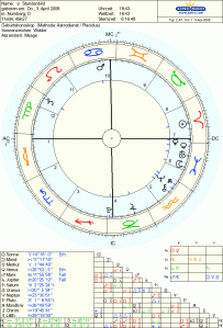Die Waage steigt zum Zeitpunkt ihrer Frage auf. Das ist einerseits schön, weil dann die Venus der Planet ist, mit dem die Fragende selbst gemeint ist, andererseits zeigt es aber auch, dass die Frau sich in einer Situation befindet, wo sie ihre Interessen „abwägen“ müßte. Der Mond ist immer Nebenherrscher der Fragenden. Er steht im Zeichen Fische und im Haus 6, einem fallenden Haus. In diesem Haus befindet sich auch ihr „Hauptsignifikant“, die Venus. Nun ist bedeutend, dass im Haus 10, dem Lebenszielhaus, Krebs herrscht, das Familienzeichen. Und genau dort befindet sich der Planet, der ihren Mann darstellt, nämlich Mars, Herrscher von Haus 7. Man kann nun daraus schließen, es ist tatsächlich der Mann, der sich zur Hauptaufgabe in ihrem Leben aufgeschwungen hat, steht er doch mit Mars am wichtigsten Punkt, dem Mittagspunkt. Und da Mond als Herrscher des Berufshauses und der Signifikant für sie das Haus 10 beherrscht, und somit sowohl ihr Ziel, als auch ihre Sehnsucht ausdrückt, haben wir es – wie der Aszendent Waage voraussagt – wirklich mit einem Interessenkonflikt zwischen Beruf und Ehe zu tun. Dazu steht der Mond in den kosmischen Fischen, und der Mann ist Fische. Der Wunsch, sich mit einem esoterischen Beruf selbstständig zu machen, wird also gewissermaßen vom Mann dadurch verhindert, dass er diese Stelle in Personam besetzt. Mit praktischer Esoterik, hier Kartenlegen, zu arbeiten ist aber auch die Aufschlüsselung zu Mond und Venus in Haus 6, dem Haus der praktischen Lebensbewältigung. Wird sie es schaffen?