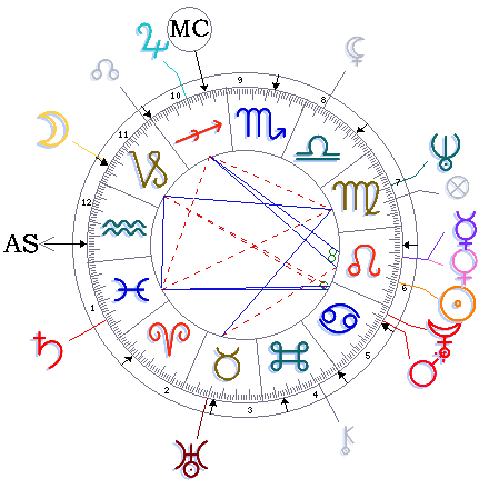 Über den Jupiter in Haus 10, der ja aich hier zu einem erfolgreichen Mann gehört, müssen wir uns schon nicht mehr wundern. Die Sonne im Löwen in Haus 6 – dem Haus der Handarbeit – macht den Schneider. Merkur und Venus dazu in Konjunktion: vuala! Mars im Krebs ist der eher weiche Mann. Saturn in den Fischen kann nur fassen, was er glaubt. Uranus im Stier Spitze drei verbindet und revolutioniert Kommunikation und praktische Sehnsucht mit Neptun in Haus sieben in der Jungfrau, beide also in Erdzeichen: die Sehnsucht und die Revolution sollen also wirklich werden, und kommunikationsfähig sein. Mond im Steinbock an der Spitze zu Haus 12 ist das Familienkarma (Mutter) in Verbindung mit Kreativität (Haus fünf) und Arbeit (Haus 6). Zur Kombination Sonne im Löwen und Mond im Steinbock schreibt Oskar Adler: „Hier entsteht die seltsame Veranlagung, die Bejahung des Lebens und seiner Freuden wie eine ernste Pflicht anzusehen. Man könnte von Sonnenanbetern sprechen, von Menschen, die durchaus Anhänger oder Verkünder einer eudaimonistischen Lebensphilosophie sind und die Freude als die stärkste moralische Kraftquelle ansehen, niemals aber außer Acht lassen, dass die Pflege dieser Überzeugung mit dem Ernst einer tiefen Verpflichtung durchgeführt werden muß.“ Die Ihn kannten, werden wissen, ob das passt. Was die Mode betrifft, gebe ich eine gewisse Ambivalenz zu. Einerseits bin ich eher für die Lilien auf dem Felde, die sich nicht von morgens bis abends um ihre Kleider sorgen sollten. Doch versteht man obiges Zitat richtig, so war das auch Laurents Meinung. Das Zauberwort heißt Anmut. Um die zu haben, muß frau/man nicht bekleidet sein, aber man/frau kann es. Nur im Wasser, da bin ich eigen, sollte man auf Kleidung immer verzichten, da wird sie schließlich nass. Bitte diese Haltung nicht zu verwechseln mit Freikörperkultur. Alles, was extra betont werden muss, ist nicht frei, sondern gezwungen, wiewohl heutzutage auch dies, als Gegenpol, Berechtigung haben mag. Bei Saint Lauren, war es der Neptun über dem ohnehin schwierigen Wassermann Aszendenten und Pluto in der Opposition, der ihn dahingerafft hat aus Gnade vielleicht zur immer falschen Zeit. Möge Jesus ihn führen!