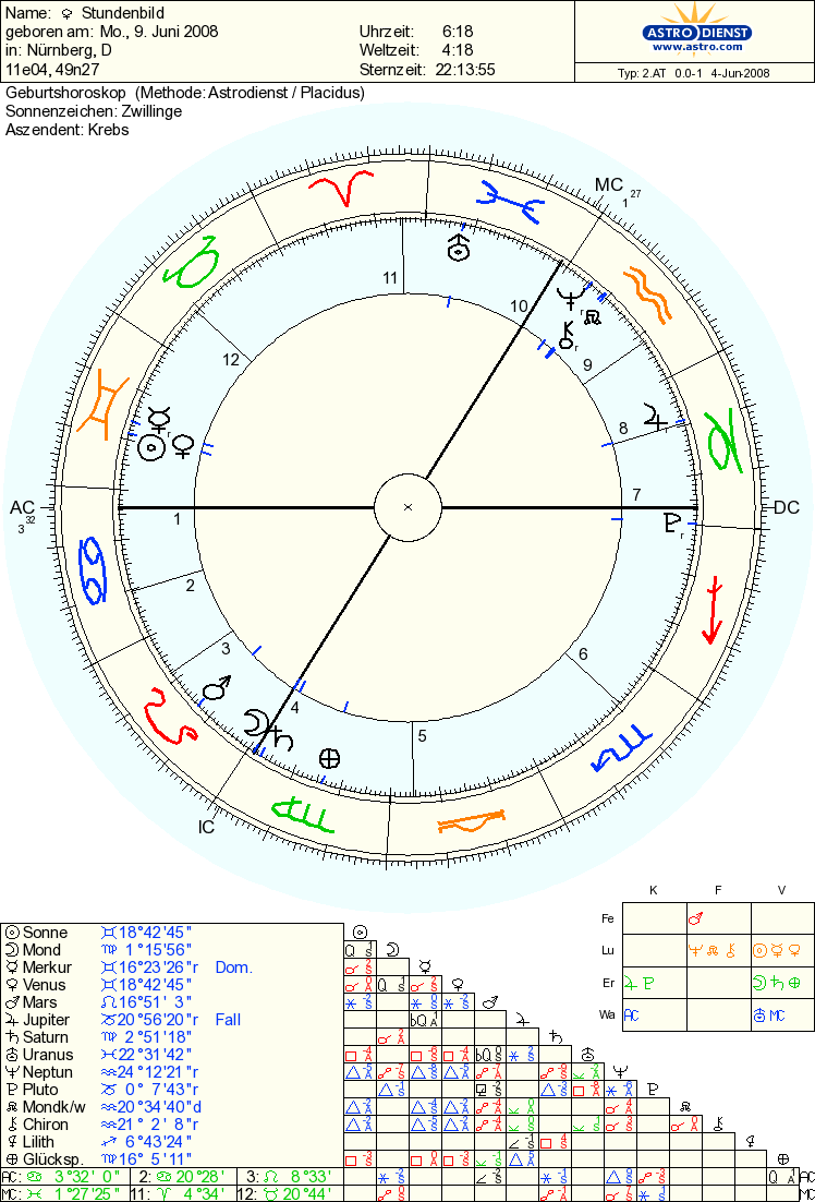 Wie, um das zu unterstreichen, geht der Mond in der Jungfrau eine Konjunktion mit Saturn ein. Grals-Kelch (Saturn) und sein flüssiger Inhalt (Milch?) Mond sind verbunden, und halten dem Gefühlskörper Vorträge über Respekt, Fragen, die man dem König stellt, damit seine Wunde an den Lenden heilen kann (Parsival). Der Wandel, Uranus, gebärdet sich stark im Haus 10! Unsere Casimi-Venus steht einsam am Strom des tiefsten Wissens in Haus 12, in den Zwillingen mit der Sonne, kurz nach deren Aufgang. Sie regiert Stier und Waage, beherrscht den Anfang des zwölften und des fünften Hauses , und so geht es zu dieser Stunde um den Besitz (Stier) und das Wissen (Zwilling) aller Menschen, dem großen, gemeinsamen Bewußtsein – kollektiv ist es, ozeanisch: „We are all one“, von dem aus auch das Haus des Glücks, hier das Waage-Haus beherrscht wird. Wohl den Liebespaaren, die um diese Stunde wach sind, und ganz versteckt (Haus 12). Sie lieben sich stellvertretend für die ganze Menschheit.