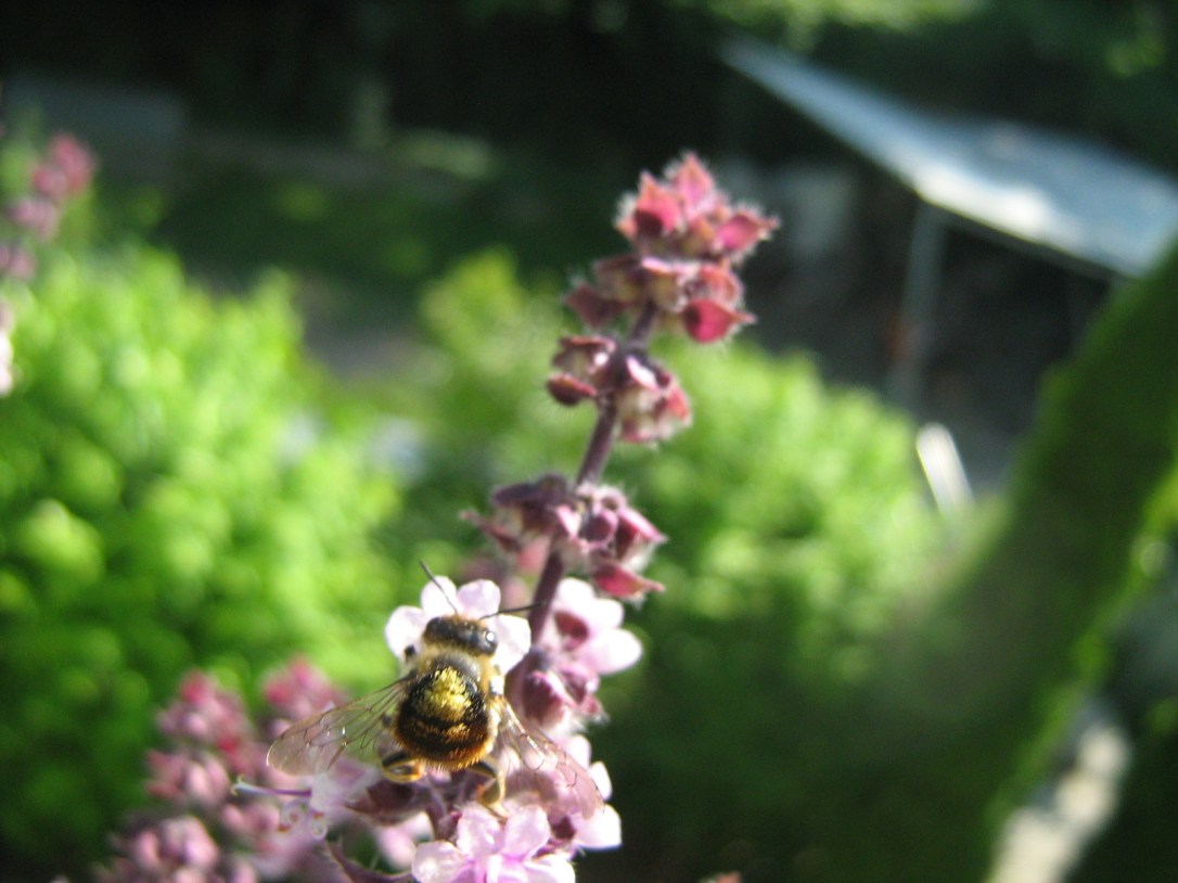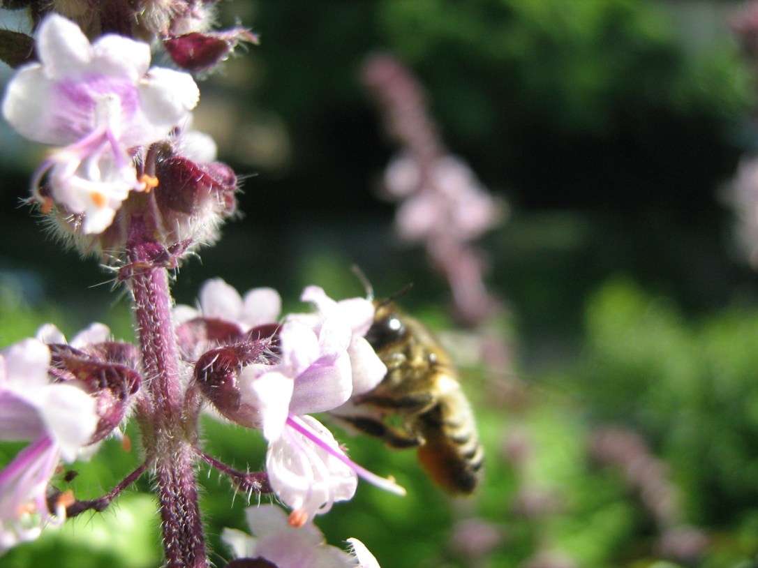 Nürnberg, 17:40 – hier seht ihr die Biene auf meinem roten Basikum. Die Aufnahme ist zwanzig Minuten alt. Gar nicht so leicht, mit dem Super-Makro, weil´s Zufall ist, ob das Bild – die Kräuter wiegen sich im Wind – scharf wird. Dieses ist auch nett, der Basilikum scharf, die Biene unscharf. Doch bin ich mir beim unteren