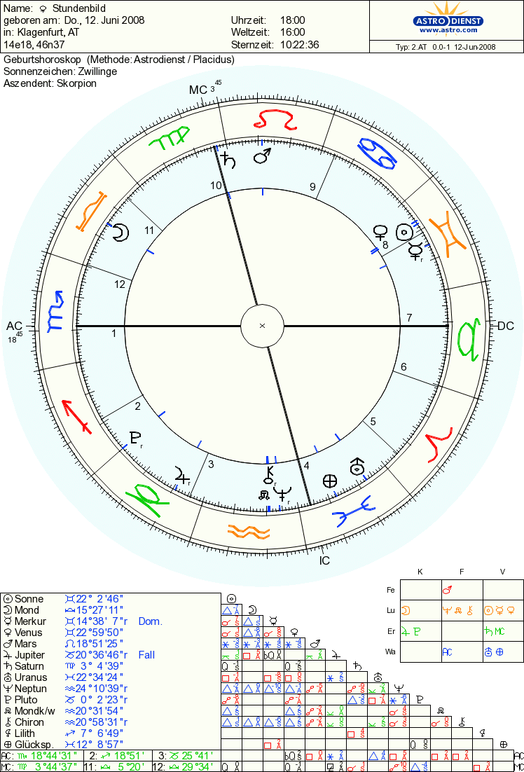 Beim zweiten Spiel des Tages kann man wirklich keine Voraussagen treffen, auch keine falschen: denn beide Länder sind Waage Länder und beide spielen in einer Waage Stadt. Polen, Österreich und Wien. Beim ersten Spiel ist es wieder Interpretationssache: Mars sollte Deutschland sein. Er steht in Haus 9 im Löwen. Er regiert das Haus 5 = Glück im Spiel. Kroatien wird als Jungfrau-Land (auch Wassermann) betrachtet. Nun steht Jungfrau im Sieger-Haus 10, und Merkur, der die Jungfrau regiert, ist in einem Eck-Haus, also dort stark im eigenen Zeichen. Doch dieser Merkur hat keine Aspekte in der Zukunft außer ein Quadrat zum Glückspunkt, was negativ ist. Reicht das? Mars für das Widderland Deutschland hingegen unterhält mit seinem Sexitil zum Mond in der Waage einen guten Ballkontakt zum Waage-Publikum (Mond), doch da ist die Opposition zu Rahu, dem Mondknoten oder Drachenkopf. Mars hat schon harmonische Sextile, doch die sind Vergangenheit. Einzig Merkur wird sich nochmal wenden, und in Zukunft wieder einen harmonischen, annähernden Aspekt bilden. Und erst noch die Oppositionen zu Neptun und Chiron! Ich habe nun eine Meinung, werde die aber für diesmal für mich behalten. Wer die Überlegungen oben nachvollziehen kann, mag auch gegenwärtigen, dass dies ein Spiel ist, bei dem es darauf ankommt, den Planeten die richtige Bedeutung zuzuordnen, und auch, dass die Botschaft nicht immer eindeutig ist. Nachtrag 21:12 – Nun will ich nicht sagen: „Ich hab´s ja gewußt“ Die Deutschen haben 1:2 verloren.