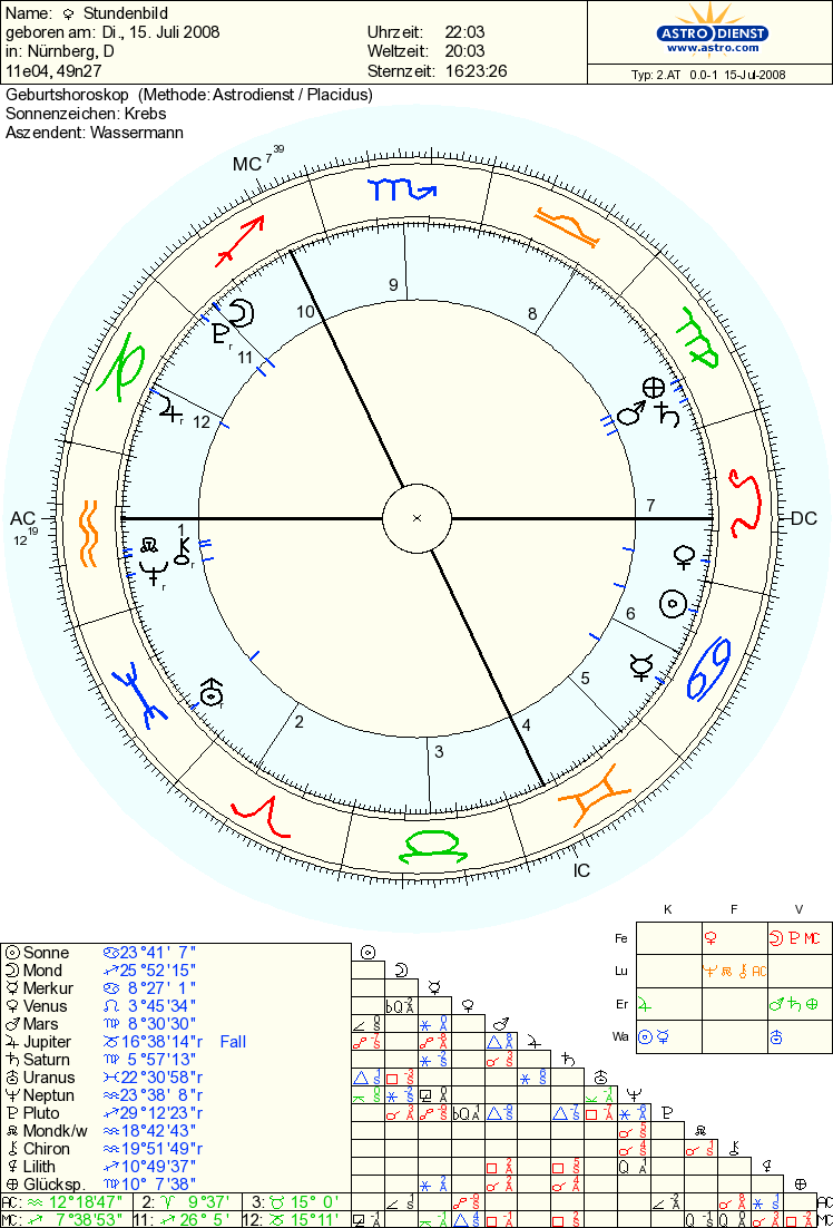 Hartkirchen 21:32 – Dieser Post stammt aus dem tieferen Bayern, ganz nahe beim Inn, an der Grenze zu Österreich. Mars steht heute und die nächsten Tage im Trigon zu Jupiter. Mars in der Jungfrau und Jupiter rückläufig im Steinbock. Während also der eine voranschreitet, und Dinge begünstigt, die auf klarer Analyse und dem Einteilen von Kräften beruhen (vielen Dank für den Tip, Nicola!), geht der andere zürück, und übergibt, wenn der Aspekt von 120 Grad exakt wird, wie bei einem Staffellauf die Botschaft des Wachstums durch innere Stärke und Beharrlichkeit, also die gegenwärtige Jupiter-Steinbock Botschaft an den inneren Mars-Krieger, der im individuellen Horoskop einen Menschen kennzeichnet, dessen große Stärke im analytischen Erkennen des richtigen Ansatzpunktes liegt. Der genau Übergabetag: 27 Juli 2008. Beide Planeten, Ares und Zeus, sind in Erdzeichen. Es geht also um wirkliche, gestaltbare, anfassbare Dinge, um handhabbare Prozesse. Mars hat seine Bindung an Saturn hinter sich: es kann also losgehen! Und Jupiter bildet auch noch ein Trigon zu Saturn, welches sich zweimal erfüllen wird. Das ist ein „Herrschaftsaspekt“, den wir nutzen sollten, um das Gute, Wahre und Schöne voranzubringen. Ab dem 9. September darf der langsame Zug beschleunigen, dann geht Zeus-Jupiter direkt. Doch warum, mag manch einer fragen, wirkt ein Planet bei einem exakten 120 Grad Aspekt direkt und harmonisch, bei 125 Grad jedoch weniger stark? Es gibt beobachtbare Idealmaße, so, wie es Quadrate und Kreise in der Natur gibt. Es sind dies keine der Natur angelegten, sondern ihr abgeschauten Verhältnisse. „Welchen Winkel benötigt ein Eisen (Mars), um seine ganze Kraft zu entfalten, und wann ist er eine Brechstange?“ Daraus wird ersichtlich: es gibt einen idealen Ansatzpunkt. Nicht an den Zahlen liegt es, sondern an dem Rhythmus, der sich vielfältig, beispielsweise als Überlagerung von Wellen durch die Natur, deren Teil wir selbst sind, selbst (sic!) zeigt. Hier beim Inn begegnen sich drei Flüsse, die in Passau alle zur Donau werden. Man stelle sich nun vor, sie treffen in einem 120 Grad-Winkel aufeinander, im 90 Grad- Winkel, im 60 Grad- Winkel, ect. Diese Winkel, so haben unsere Vorfahren beobachtet, entscheiden über ein harmonisches oder dishartmonisches Mischungsverhältnis. Leicht einzusehen, dass der 90 Grad-Winkel ziemliche Turbulenzen hervorruft! Nicht vergessen werden darf dabei – für all die Mathematiker unter uns – die Astrologie und die Beobachtung der kosmischen Rhythmik hat die Zahlen als ganze Zahlen und die einfache Lehre der Verhältnismäßigkeit hervorgebracht. Im Klartext: wenn man sich, wie Einstein, fragt, warum denn wohl die Natur sich so treffend in Formeln beschreiben läßt, so liegt es eben daran, dass diese Formel ja aus der Natur selbst gewonnen wurden. Aus diesem Grund ist meines Erachtens auch eine über-artifizielle Astrologie der Natur nicht entsprechend. Generell sollte man sich also nicht wundern: „Warum funktioniert Astrologie?“, sondern man darf sich fragen: „Warum hat sich die Idee der Funktion ihres astrologischen Ursprungs so weit entfremdet, dass die Tochter Mathematik ihre Mutter Astrologie nicht mehr kennt und oft genug verspottet?“