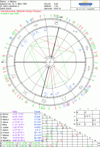 Nürnberg 22:54 ist eigentlich sehr einfach, aber es wird in Astrolgiebüchern meines Wissens nicht erwähnt bisher. Die Entdeckung habe ich – nicht erst heute – an Merkur gemacht, der sowieso mit der Verbindung zum Denken die schnellste Umleitung ist. Trotzdem brauche ich oft Wochen, mitunter Monate, bis so ein Prinzip wirklich in den praktisch verwendbaren Erfahrungsschatz übergeht; ich muss mehrmals drauf gestoßen werden. Auch nehme ich für mich in Anspruch, mein eigenes Horoskop (zwei mal draufklicken!) …