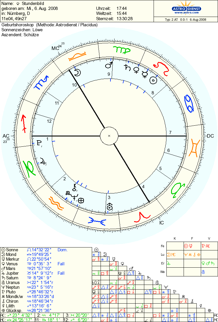Nürnberg 17:47 – heute heißer Löwe-Sommer, die Kinder vorm PC, im Schwimmbad oder im Urlaub, da haben wir zwei starke Oppositionen im Horoskop: Merkur im Löwen zu Neptun im Wassermann und Mars in der Jungfrau zu Uranus in den Fischen. Bitte zwei mal anklicken: