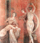 Dabei spielte der Wein eine wesentliche Rolle, wobei wir bedenken müssen, dass Wein damals ein Mischgetränk war, dem oftmals außer Honig noch ganz andere Dinge beigemischt wurden, die wir heute als starke und vielleicht sogar illegale Drogen bezeichnen würden. Aus den Fresken geht hervor, dass es einen ritualisierten Ablauf der Einweihung gab. Jedes Bild in dem roten Raum zeigt einen Seelenzustand der Einzuweihenden. Mal wird sie als Kind, mal als als reife Frau dargestellt, mal in Trauer, mal wissbegierig, mal tanzend und voller Freude. Das Wissen, welches die Einweihung vermittelte, lag also jenseits dieser Zustände, sogar jenseits von Jugend und Alter. Bezeichnend ist, dass alle, die den Weg der Einweihung beschritten, dieselben Erlebnisse machten. Zum einen waren sie geführt von kundigen PriesterInnen, zum anderen aber ging es gerade darum, eine Reise durch die Bilder nicht des individuellen, sondern des kollektiven Bewußtseins zu machen. Denn man wußte damals: nicht nur eine Erinnerung an unsere eigene Geschichte haben wir als Gedächtnis, sondern viel mehr noch eine Erinnerung an Dinge, die wir selbst als Teil der Menschheit vor langer Zeit erlebt haben, und je tiefer diese Erinnerung zurückreicht, um so weniger kann von individueller Erinnerung gesprochen werden. So war es in den Mysterien möglich, ganz wie in einem Film, eine Geschichte im Inneren der Einzuweihenden sich abspielen zu lassen, durch die sie sich tief getröstet und mit dem Weltganzen vollkommen harmonisch verbunden fühlten, ohne weiter Angst vor dem Leben oder dem Tod zu haben, denn sie hatten das Jenseits zu dieser Pforte in der Einweihung überschritten. Dionysos, der mit dem Efeu und dem Wein verehrt wurde, war dabei einer von vielen Göttern der Antike, die getötet, zerstückelt und sogar gegessen wurden, um hernach wieder aufzuerstehen. Diese Wiederauferstehung wurde konkret als Wesen der Fruchtbarkeit verehrt und vollzogen, und das „Sterben des Gottes“ fand oft genug als ritualisierter Wahnsinn und konkrete Kastration statt. Es mag furchtbar klingen, aber auch Jesus ist so ein Dionysos. Dass er dessen Mysterien in gewissem Sinn übernommen hat, zeigt die Hochzeit von Kanaan, wo er Wasser in Wein verwandelt, und auch die katholische Lithurgie, wo durch Wein sein Blut repräsentiert wird. Inwiefern der kannibalistische Aspekt als tiefste Grundlage des Kults verdrängt wird, oder gar in jenem dämmerhaften Bewußtseinszustand präserviert wird, in dem, genau wie beim Dionysos-Kult, der kollektive Erinnerungshintergrund an eine grausame Vergangenheit – also unsere Schuld – wachgehalten wird, dessen sublimierter Zwischenschritt die Circumcision wurde, die Jesus, zumindest prinzipiell, als Zeichen des Bundes aufkündigte, das mag dahingestellt sein.