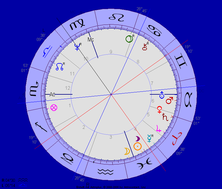 Also auch ein Fisch. Und sogar den Mond in den Fischen. Der Mann, der hier so jung aussieht, weilt nicht mehr unter uns. Er ist der typische Märtyrer. Sein Totschläger hatte ein Hitler-Portrait an der Wand. Mit Mond und Sonne in den Fischen war Rudi Dutschke nicht von seiner Überzeugung abzubringen, kocht seine eigene Suppe der Überzeugung und will auch andere Menschen dazu bekehren. Und doch: er hatte ja Recht! Mir ist nicht bekannt, dass ihm das Bundesverdienstkreuz verliehen wurde, und er hätte es wohl abgelehnt. Mit solchen Männern gäbe es keine aktuelle Finanzkrise, die u.a. der Ignoranz gegenüber menschlichen Besitz- und Arbeitsverhältnissen geschuldet ist. Sein Jupiter im Widder in Haus 5 – er wollte zunächst Sport studieren, was ihm verweigert wurde, weil er seinerseits die NVA verweigerte – ließ ihn zum geborenen Leitwolf (Wolf ist das indianische Fische-Zeichen) der 68ger Bewegung werden. Sein Pluto im Löwen macht ihn zum Lehrer in Haus 9, Mars im Stier in Haus 6 zum praktischen Arbeiter: das ideale Horoskop für den richtigen Mann zur richtigen Zeit. Diese Bundesrepublik hat ihm als wandelndes Gewissen unendlich viel zu verdanken, und ihn doch – wegen der Sturheit ewig Gestriger – kann man sagen: auf dem Gewissen? Sie ist sich dessen jedenfalls nicht bewußt. Ob das noch kommt?