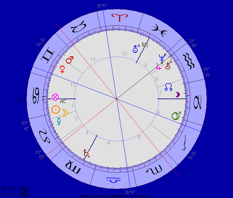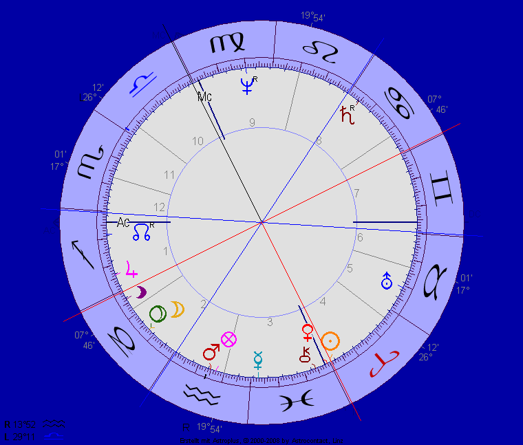 Nürnberg, – 00:18 Widder. Der Anfang des Jahres. Des wahren Kalenders! Astrologisch ist heute Jahresanfang. Dieses Jahr ist das einzig logische. Wir teilen das Jahr nach Tag- und Nachtgleiche, die übrigens heute auf der ganzen Welt gleich ist. Mit dem Frühlingsanfang reift in Südafrika der Herbst. Und auch am Nord- und Südpol ist der Tag gleich lang. Daher die ungeheure Bedeutung dieses Tages! Zwischen Chicago und Detroit läuft übrigens die neue Widder-Sonne genau am AC. Auf unserem Horskop, also für den Längengrad, auf dem sich Nürnberg befindet, da ist der Aszendent auf dem Grad ungefähr-genau auf dem der Sonnenfinsternis, die wir im Juli in China sichtbar haben werden … Das könnte Veränderungen für Chinas Regierung bedeuten, und zwar davon in Folge, im Herbst. Im Horoskop von China ist der Sonnenfinsternisgrad im Haus der Arbeit; hat ein Trigon zur Himmelsmitte. Also verändert sich auch die Regierung, jedoch ohne starken Umbruch.