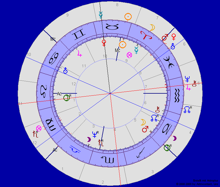 Sein Mond und der Mars im Steinbock im kreativen Haus 5 (jetzt mit Pluto-Transit, also einer massiven Veränderung und auch Angriffen ausgesetzt) portraitieren den verbissenen und coolen Kämpfer mit eben den Mitteln der Kreativität. Merkur im Widder verbindet Intelligenz mit Inspiration und Provokation. Uranus in Haus 12 befreit das Gegenüber durch das Kollektive Unbewußte. Überhaupt Uranus dort: dies ist ein Beispiel, wie man diesen Planeten bewußt leben kann. Wenn Saturn, wie bei ihm, durchs Haus 2 läuft, bedeutet das nicht unbedingt, dass man arm wird, wie eine Kirchenmaus. Man könnte eher „Konsolidierung“ dazu sagen. 1989, während sein progressiver Mond im Widder in Konjunktion mit Merkur stand, dem Herrn von Haus 11 und gleichzeitig der progressive MC die Spitze des 11. Hauses berührte, trat er zuerst an die Öffentlichkeit.