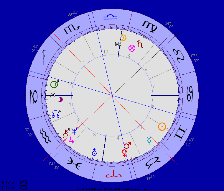 Eingestellt habe ich die Pluto/Pluto/Mars-Trigon Verbindung, die durch ein drittes Trigon des laufenden Mars auch noch ausgelöst wird. Dass Pluto im Haus 3 der Fünften Republik steht, betrifft darüber hinaus passend ihr motorisches Prinzip, die Bewegung.