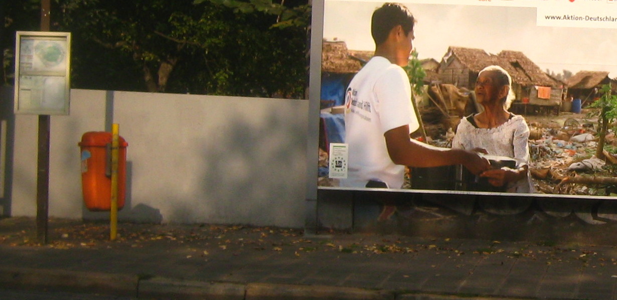 Auf obigem Foto hilft als Bild im Bild ein junger Mann einer schönen älteren Frau. Im Hintergrund ihre zerstörte Hütte, im Vordergrund Plastikabfall. Wertvoller, ungenutzter Rohstoff. Das Bild gehört zu der Kampagne „Deutschland hilft“: