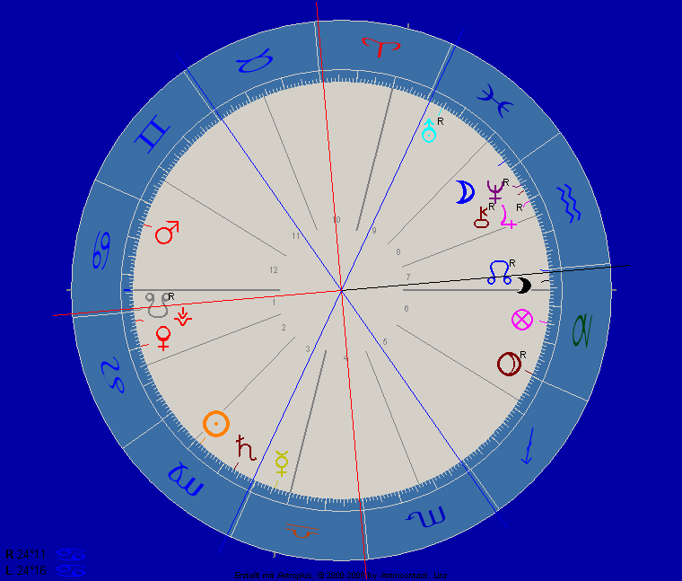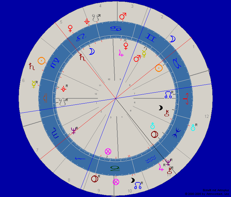 schaun wir uns mal an, was Angela Merkel für Deutschland ist? Ihre Krebs-Sonne fällt bei Deutschland ins Haus 12, ihr Wassermann-Mond in Deutschlands Haus 7. Sie wird Deutschland lange regieren, wahrscheinlich ebenso lange wie Helmut Kohl, wenn ihre Gesundheit das zuläßt. Das ist die schlechte Nachricht.