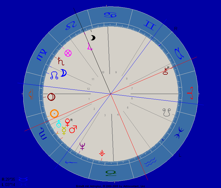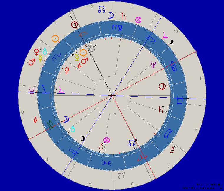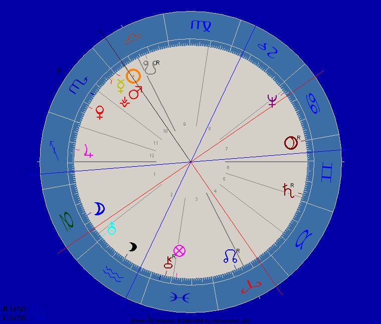… Pluto in der Waage direkt am AC in sehr genauem Sextil zu Neptun im dritten Haus, also der näheren Umgebung. Die Konjunktion mit Merkur und Venus war genau um 24:00 Uhr! Da das zweite Haus der Körper ist, zeigt dies wohl den Psychopompos, welcher Merkur als Abendstern ist, und Venus, einer Waage würdig, wird von dem flügelbeschuhten Seelenbegleiter Hermes in die jenseitige Welt begleitet. Angeblich sei er sitzend und lächelnd gefunden worden mit einem Buch in der Hand: Merkur wieder, und wieder Venus rückläufig.