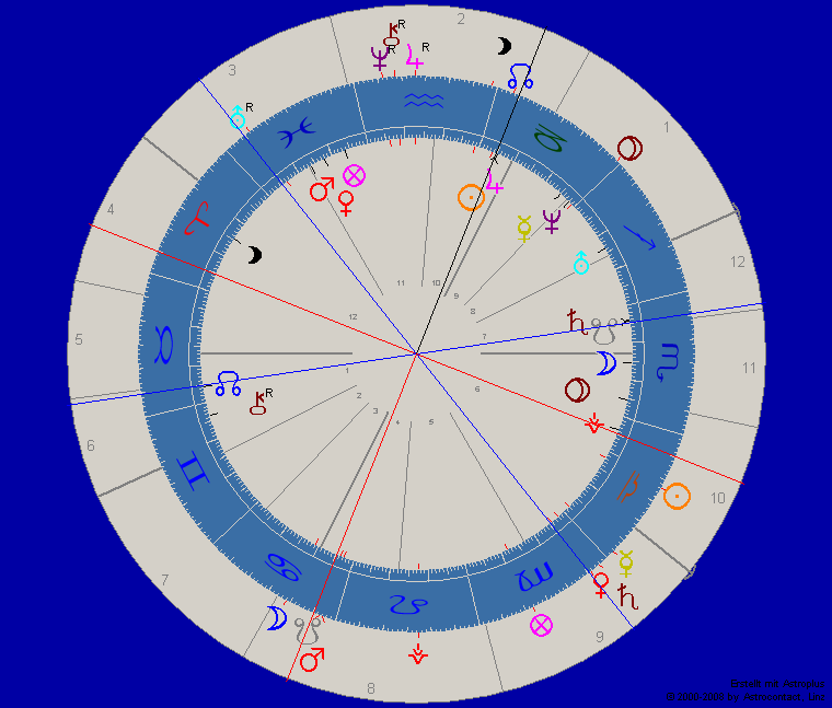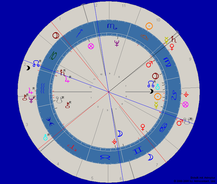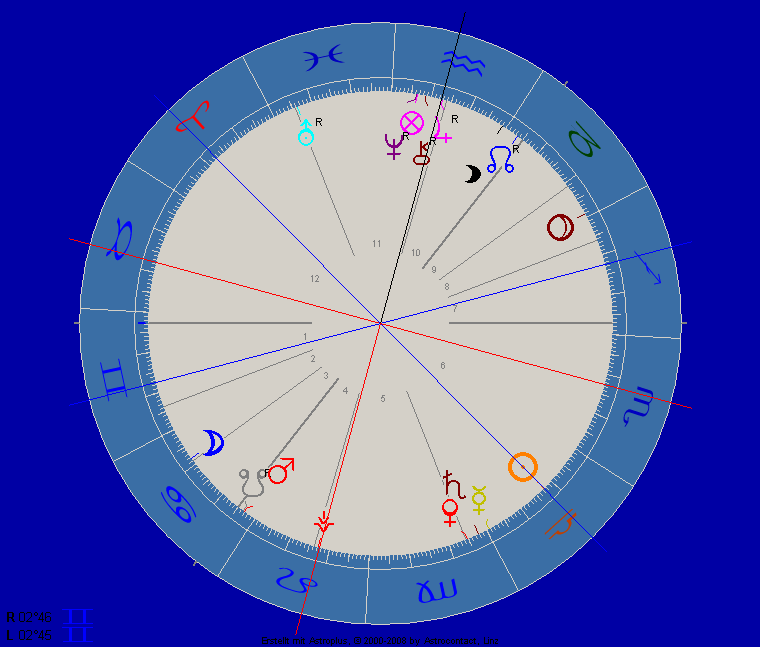 Bemerkenswert hier der Mondknoten genau auf dem Mars im Steinbock; der Sturkopf wandelt sich … Würde mich nicht wundern, wenn er mit Uranus über der Sonne erleuchtet wird und einen Ashram gründet …
