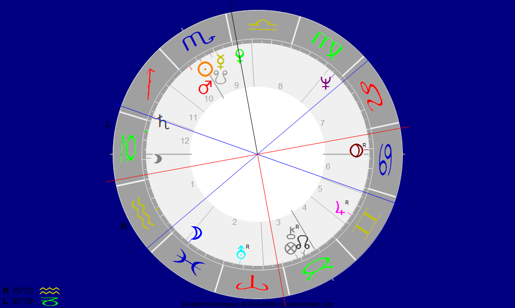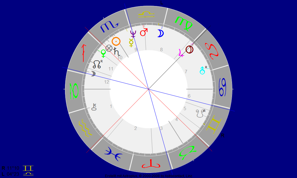 Saturn steht außerordentlich stark, als da wären: in einem Eckhaus, in der Erhöhung, im Sextil zum AC und zur Sonne. Damit kann Mond im Schützen, Deutschland, nicht konkurieren. Er hat im Schützen, anders als Saturn, keine besonderen Würden. Einzig fraglich ist die Saturn-Position in Haus 4 in Opposition zu Hausspitze 10.