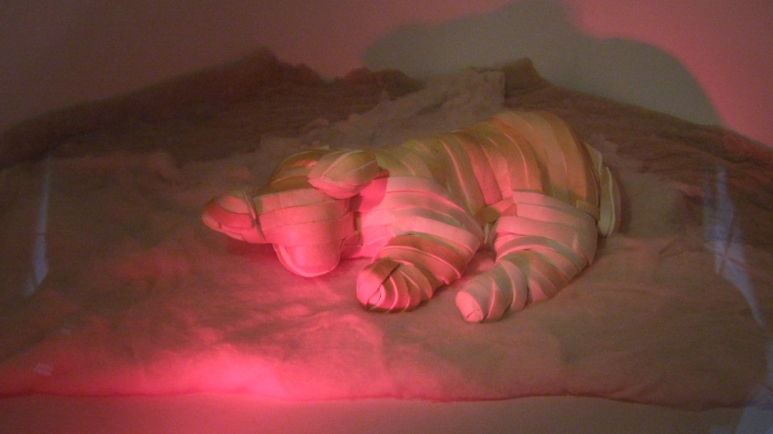 „Die Milch machts“, so heißt die Ausstellung von Susanne Dundler im „Künstlerautomaten“, einem ehemaligen Männer-„Pissort“ unter Denkmalschutz, und dem zweiten übrigens, der in Nürnberg recycled wurde letztes Jahr, der andere ist das Café Schnepperschütz. Für astrologische Zusammenhänge interessiert hier Uranus, der in den Fischen steht, denn die Fische sind auch das Zeichen des kollektiven Entsorgungsortes, in dem und aus dem die Befreiung (Uranus) hervorgeht. Der Künsterautomat bringt nicht etwa automatisch Künstler hervor, obwohl die Doppeldeutigkeit der Benennung sicher Absicht ist, (Nürnberger Humor ist so tief, daß man ihn fast übersieht: aber nur fast!) sondern fau/man kann Kunst haben aus dem Automaten. Wir werfen einen Euro ein, das Licht geht an, wir sehen eine milde, lichtdurchflutete Balsaholzlandschaft mit einem kleinen Kalb am Boden und riesigen Eutern, die über diesem Kalb hängen. Es ist eine Mystische Szene der Geborgenheit.