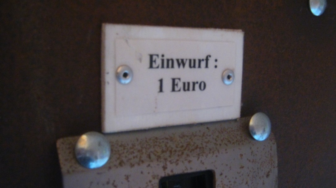 … sobald wir einen Euro in den Schlitz geworfen haben, geht eine Geräuschkulisse aus Kuhglocken zusammen mit dem Licht an. Und mehr passiert eigentlich nicht. Das Spektakuläre vervollständigt sich durch den Begleittext zur Ausstellung: