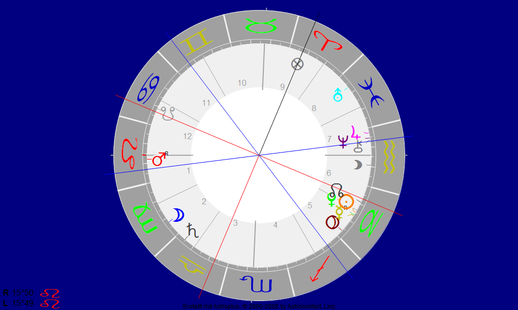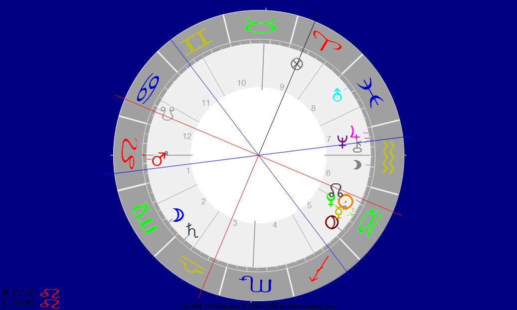 Gerade rechtzeitig fertig geworden, bevor er nicht mehr möglich gewesen wäre. Und jetzt? Ein Löwe-AC mit starker Betonung auf dem Praktischen (Mondknoten Haus 6, kollektive Vergangenheit großer Häuser = Südknoten Haus 12). Mars rückläufig am AC kann kein Astrologe empfohlen haben, gleich ob indisch oder westlich. Ob die Zeit wirklich stimmt?
