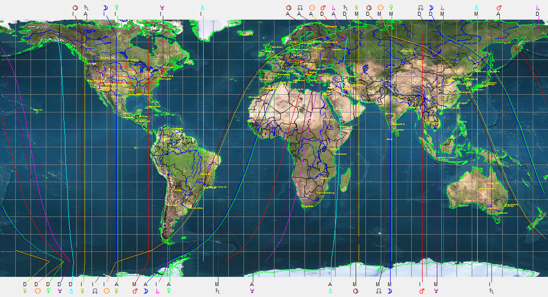 Diese Sonnenfinsternis hat sich bei mir schon in dem Post über Orangen und Schokoladenkekse angekündigt und die Tag- und Nachtbilder der Hochstrasse, bevor ich mich damit ernsthaft beschäftigte. Wer will, kann dies: Orangen (Sonne) und Mond (Kekse) als Finsternismetapher sehen. Solchermaßen und in der Resonanz von Empfindungen, finden wir sogar eine starke Wirkkraft dieser Finsternis, dem ersten Neumond des Jahres. In der AstroCartoGrafie sehen wir (Bild wird durch Anklicken vergrößert) die direkten Planetenlinien; die durch die Verbindung der kardinalen Horoskoppunkte auf unterschiedlichen Weltorten, aber zur selben Weltzeit über die Weltkarte sich erstrecken:
