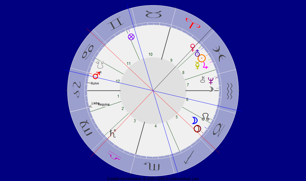Im oberen Horoskop erkennen wir die heutige Saturn-Venus Opposition. Sie bedeutet im persönlichen Horoskop die schwere Aufgabe, daß alles, was gefällt (einschließlich bei Frauen das eigene Selbstbild) leider nicht ebenso dazu taugt, Sicherheit zu gewährleisten und umgekehrt: was Sicherheit gewährleistet, nicht gefällt. Und dies wegen dem Gegensatz von Saturn (die Regel, Sicherheit) und Venus (Harmonie, Wohlgefallen), der im Horoskop angelegt ist als Rätsel karmischer Vergangenheit.