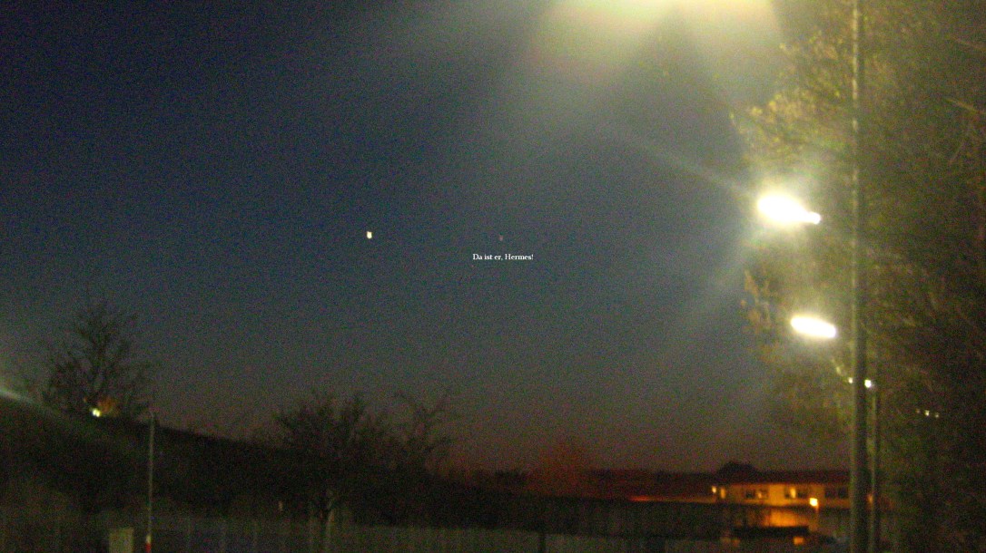 und plötzlich ist er da, es schien gar nicht so schwer … Zwischen der hellen Venus und dem kleinen Merkur sind gerade mal 1,40º – Bitte draufklicken und vergrößern, im Bild findet sich eine Überrschaschung! Merkur ist freilich in echt heller, müßte lichtempfindlicher fotografiert werden und mit weniger Umgebungsstreuung: