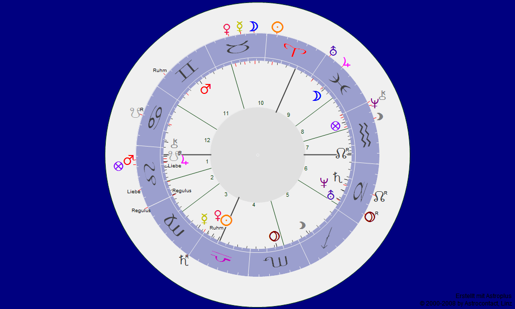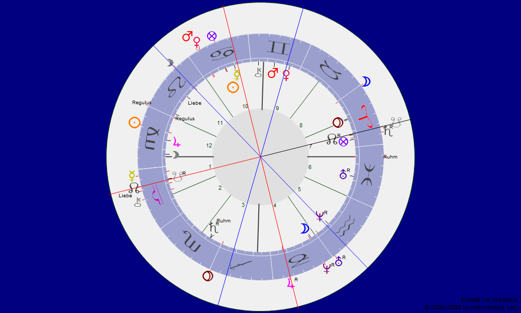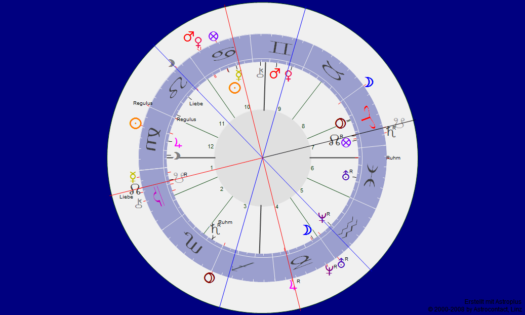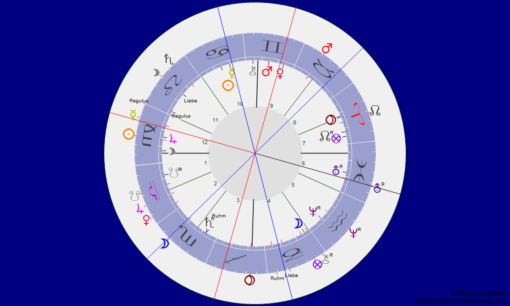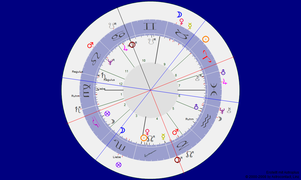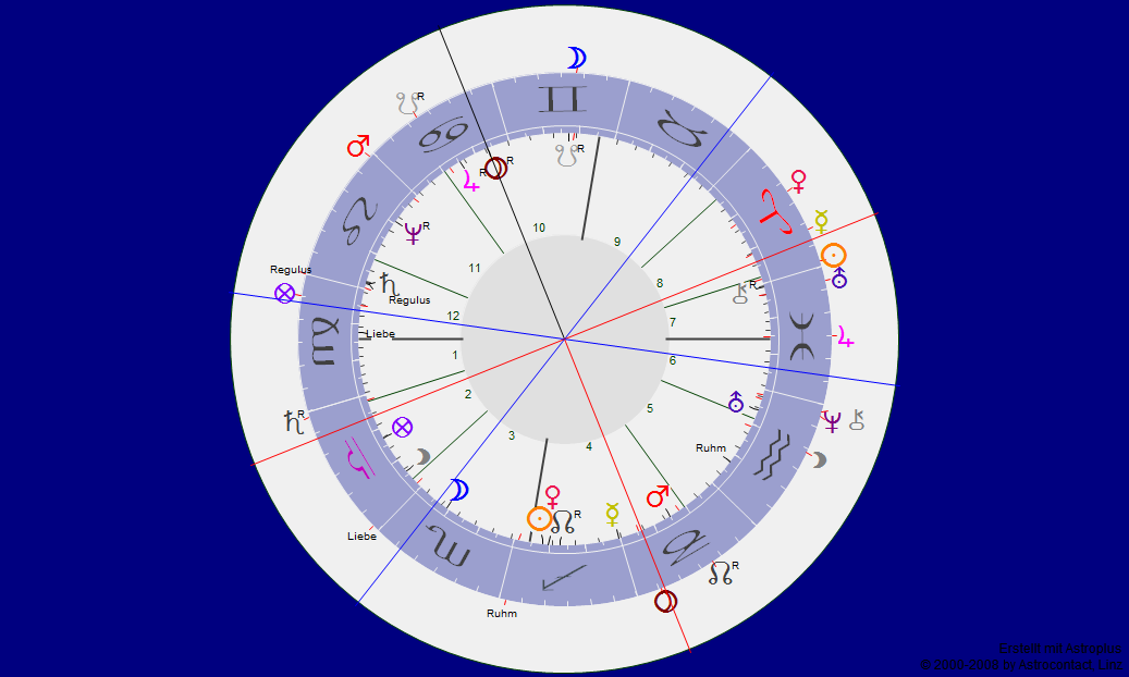 Im Deutschlandhoroskop geht Mars über den Südknoten am Aszendenten und Pluto steht über dem Uranus, Herr von Haus 7. Uranus sind also die anderen, z.B. auch die Taliban. Und Jupiter steht über dem Mond: die Propaganda wird also beim Volk, dem gläubigen Mond, wie ich fürchte, ankommen. Oktober/November könnte dann diese Regierung – unsere – wegen Saturn über der Sonne am Ende sein. Darauf bin ich gespannt, schon allein wegen Mondknoten über Saturn. Es würde sich dann endlich der rückläufige Merkur der Bundestagswahl realisieren. Und vielleicht „stolpert“ diese Regierung sogar verdientermaßen über Afghanistan. Ich habe es an anderer Stelle schon geschrieben, was mich an der Kanzlerin seit ihrem Bush-Besuch während des Irak-Krieges am meisten nervt, ist ihr Militarismus. Sie fühlt sich wohl in Männerbünden, macht, was sie immer tut: simplifizierten und hinterher lernen. Mir reicht das nicht. Und ich hoffe, der blöde Angie-Song der Rolling-Stones, den sie ständig auf den geschmacklosen Wahlkampfveranstaltungen spielen, weil sie den Text nicht verstehen, erweist sich bald für die Kanzlerin selbst als das, was er ist: ein Junkie-Abgesang. Privat mag ich sie nicht beleidigen. Vielleicht könnte Sie nach ihrer Kanzlerschaft wieder nackig im Mecklenburger Seenland baden, das ist nett. Doch, sie hat ja Jupiter progressiv ständig über ihrer Sonne. So schnell werden wir sie nicht los.