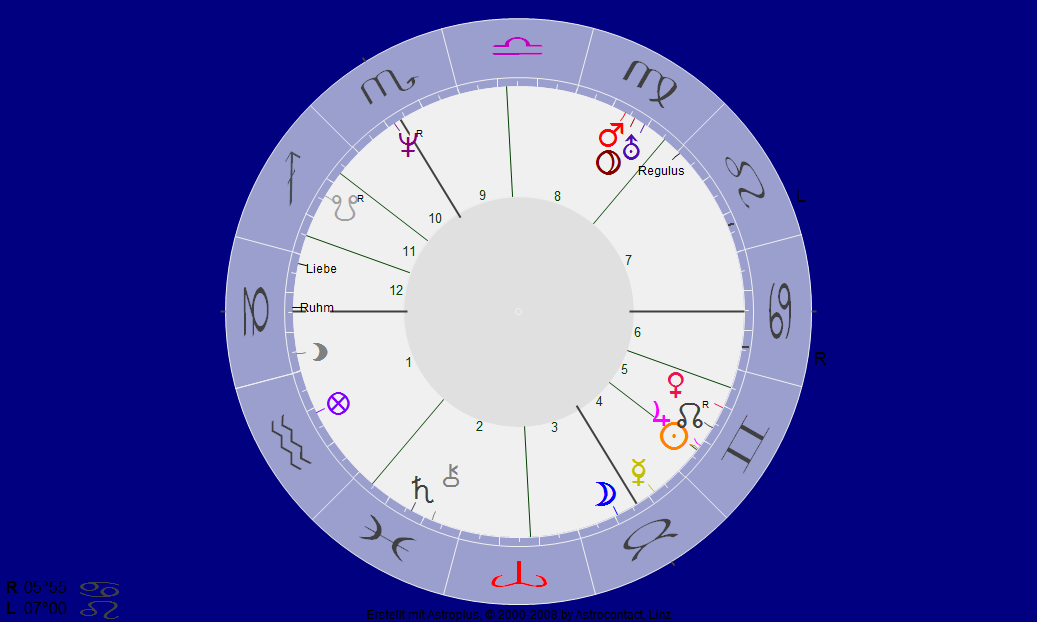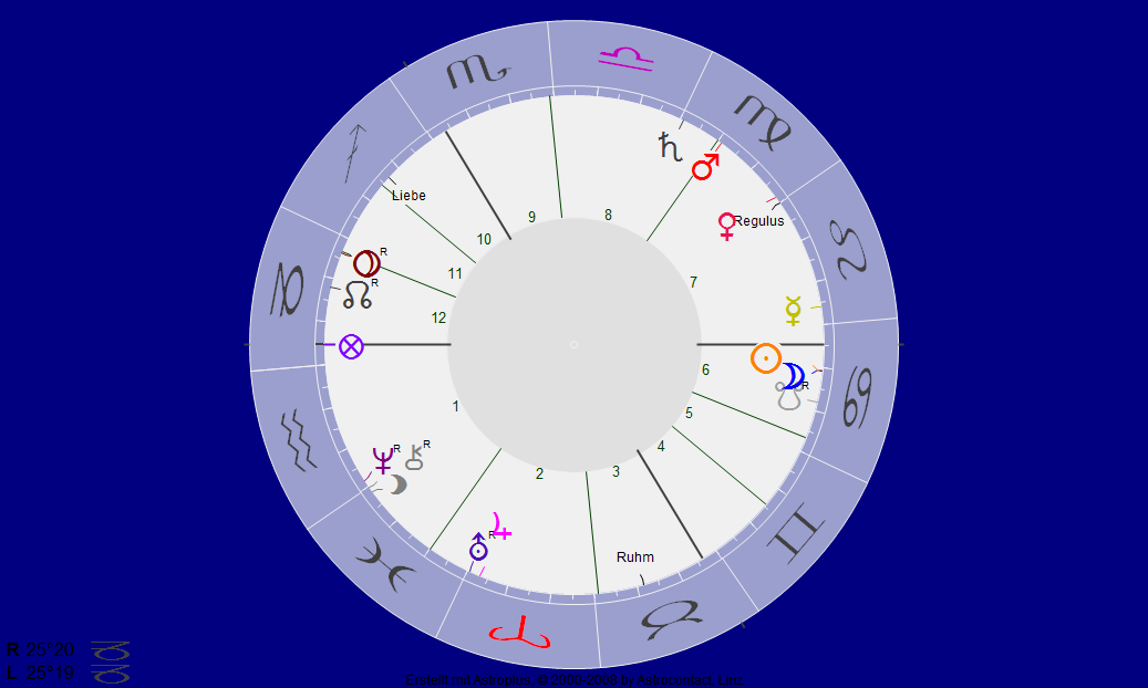 Im Horoskop unten in Opposition zur Venus, die just vom Löwen in die Jungfrau wechselt. Und da trifft die schlandsche Fussballnation die volle Wucht des Orakels zwischen Wohlgefallen im Licht der Sonne (Venus) und dem sinsistren Tiefseeungeheuer, und alle spielen mit bei dem vermeintlichen Scherz: