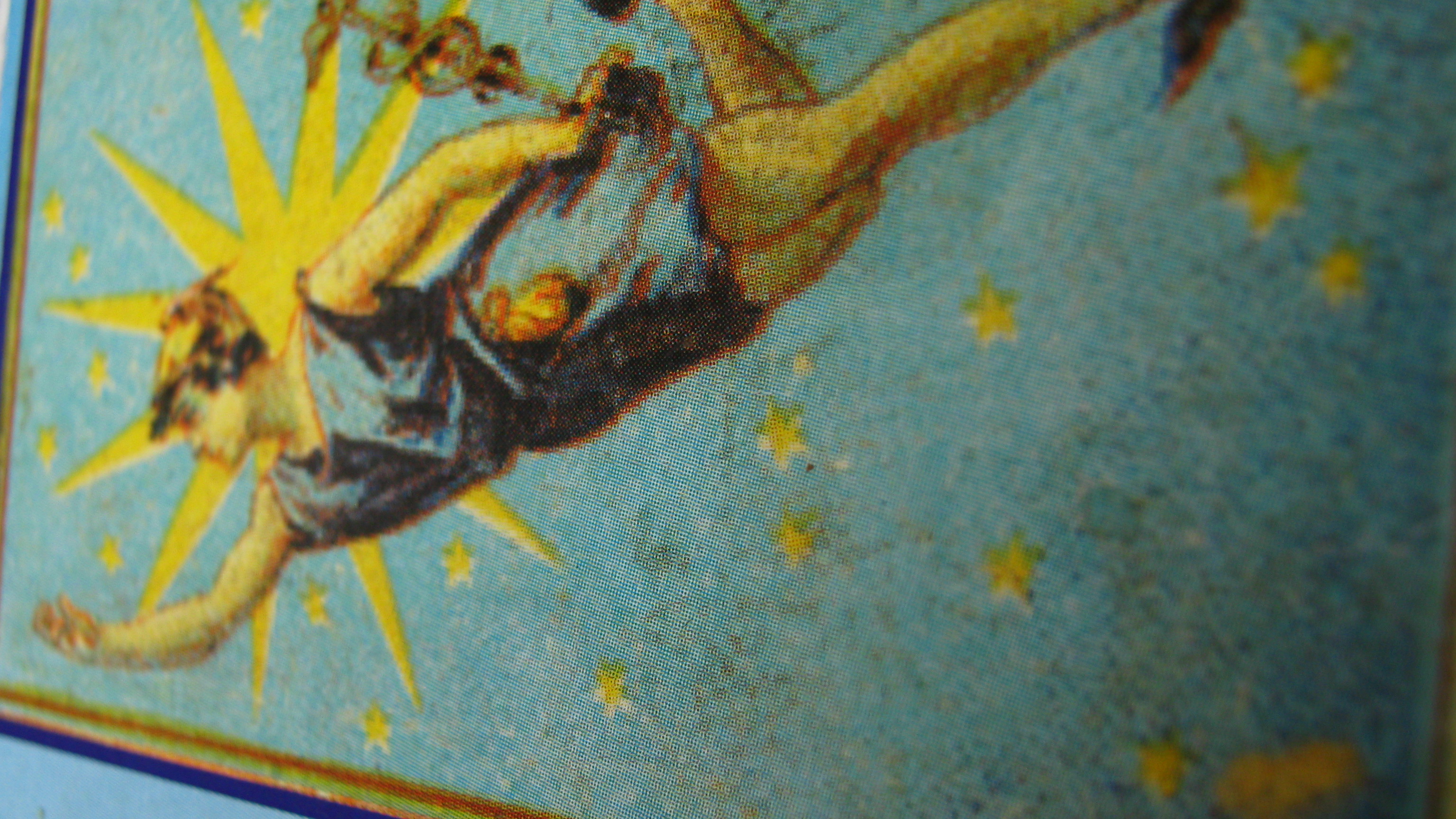 Merkur in der Jungfrau! Jungfrau ist das medizinal-Zeichen. Die Merkur-Darstellung von einer Streichholzschachtel aus Spanien passt mit diesem Röckchen ganz gut. Der junge Mann in seiner frischen, himmelsfliegenden und strahlenden Erscheinung. Wir können mit diesem Merkur den Hermes auch noch denken, aber er ist versteckt, nicht mehr offenbar. Jedenfalls ist er die Jungfrau-Medizin, die Kräuter aus Maria Trebens Buch zum Beispiel, die erstaunlich wirksam sind mit Merkur in der Jungfrau … Ordnung hilft, Ernte, Reinheit und Wäsche machen, weiße Wäsche stärken, trockenes Heu in der Scheune, gestapeltes Holz: mit heiligem Holz räuchern …