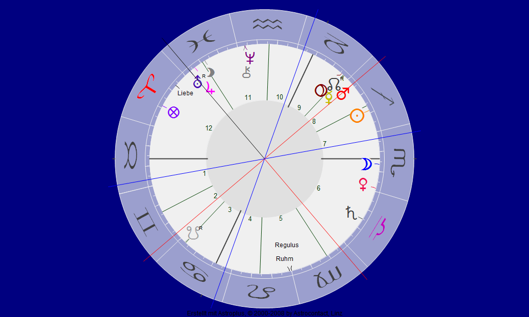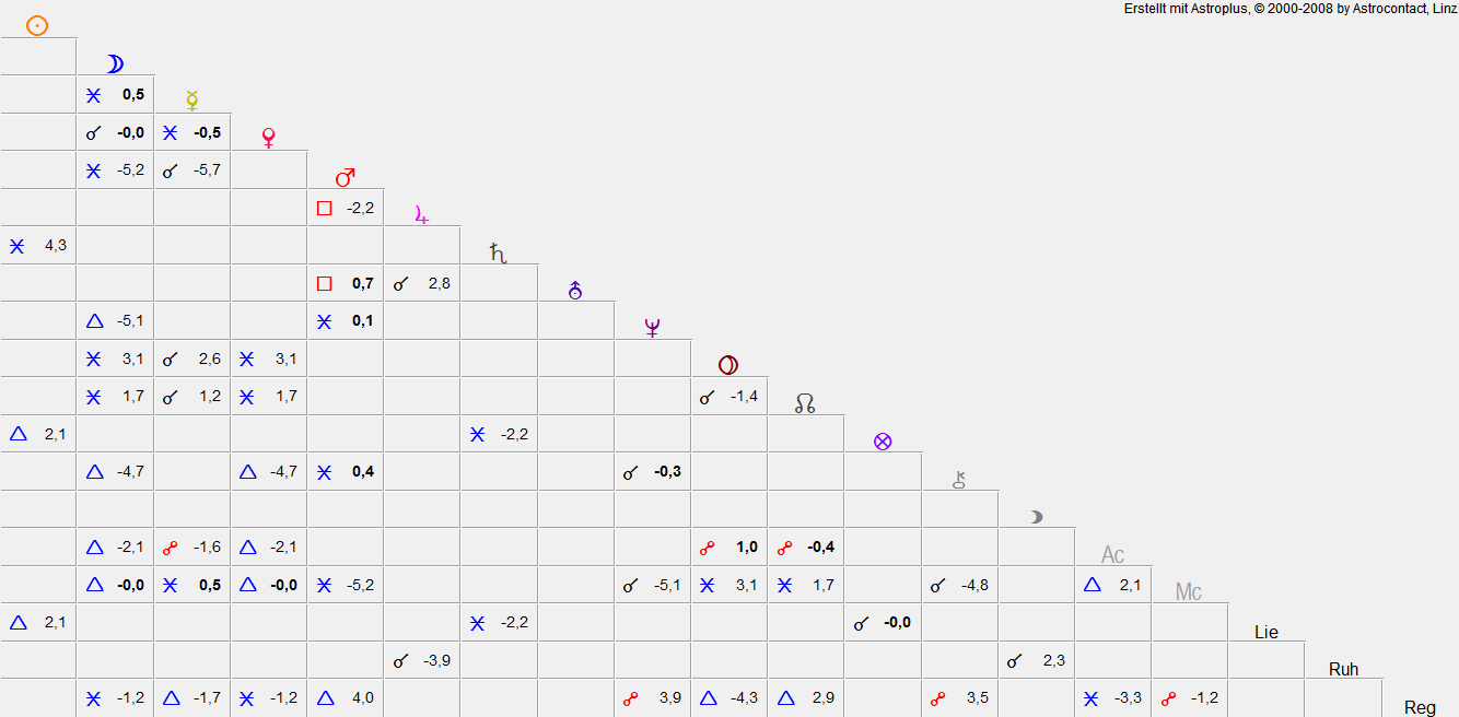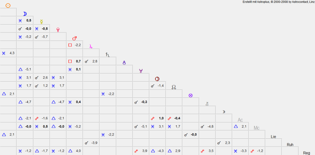 Früher könnten Mond und Venus im Skorpion allerdings zunächst leidenschaftlich von jeder Aufmerksamkeit – außer für die Leidenschaft – ablenken. Deren Konjunktion ist bereits heute um halb sechs, und da gibt´s ein Aspektbild, das ich euch nicht vorenthalten möchte – sofort sieht frau und man, wie außer dem Quadrat Mars/Uranus der Himmel voller Geigen hängt: das schöne Blau sind harmonische Verhältnisse (draufklicken, dann wird´s größer):