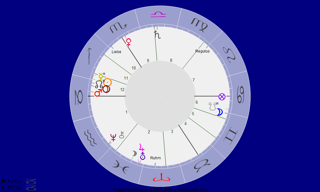 Nun hab ich mich – Horoskope untersuchend – verplaudert … all diese Themen werden praktisch täglich neu und aus anderem Licht betrachtet. Vor allem auf die mächtigen Aspekte des nächsten Jahres werden wir ausführlich zu sprechen kommen.