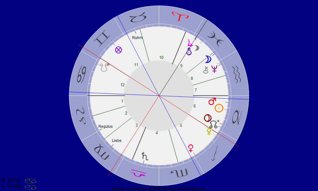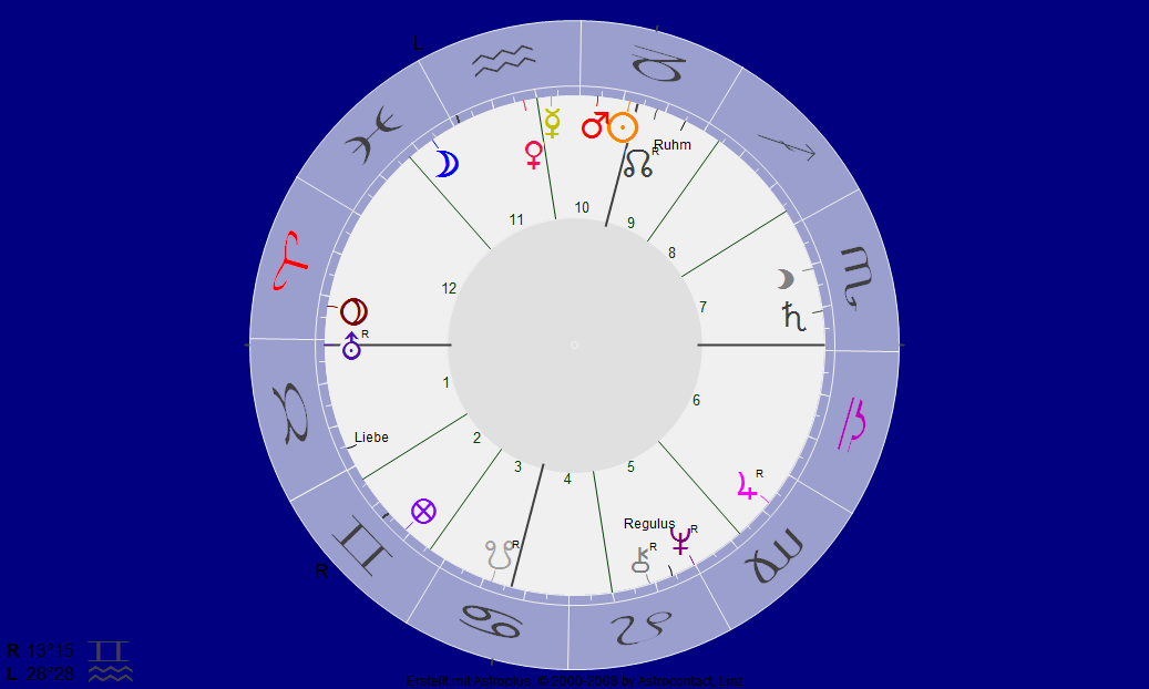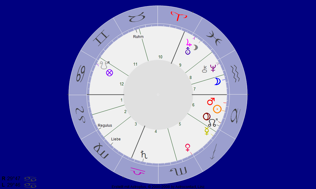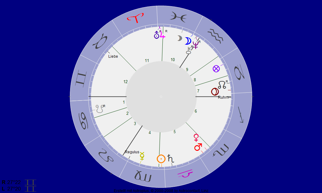 … und im zweiten Horoskop für die Zukunft, wenn Uranus und Jupiter sich im Stier treffen, und tatsächlich, wenn wir zusammenhalten, die Besitzdinge (Stier) verändern wird, erleuchten, befreien, denn auch Pluto ist dann im gesellschaftlichen Revolutionszeichen Wassermann – Astrologie des langen Atems! Besonders bemerkenswert: sowohl das „letzte“, als auch das erste neue Treffen – ich gebe zu, ungern entlasse ich den liebgewonnen Planetengott aus den Fischen! – findet im exakten Sextil zu Mars statt! Auch das habe ich für euch – Wegmarken der Symmetrie! – mit der Aspektscheibe eingestellt.
