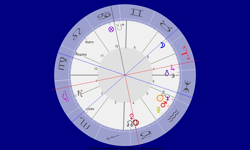 16 Jahre nacheinander hat unsere Mannschaft schon gegen Italien verloren. Wir folgen hier in der Interpretation ausnahmsweise streng nach den mittelalterlichen Regeln, die uns der große John Frawley überliefert hat, und es ist nur ein Spiel! Danach ist der Gastgeber Jungfrau und Zwilling für H 1 und H 10, sowie Mond als zweiter Hausherrscher 10. Zum Glück, denn sonst müßten wir nach Frawley für die Gäste entscheiden, die mit H 4 und H 7 vertreten sind, und daher Jupiter als Herr des Schützen und der Fische, sowie Saturn wären. Antiszie des Glückspunktes landet (gespiegelt an der 0 Grad-Steinbock-Achse) im Haus 9 in Zwillingen, gibt keinen Hinweis. Aber der Mond macht zuerst einen Aspekt mit Venus, und die steht im Haus der Gäste 4 – sie müßten gewinnen, wenn nicht Mond wir selber wären.