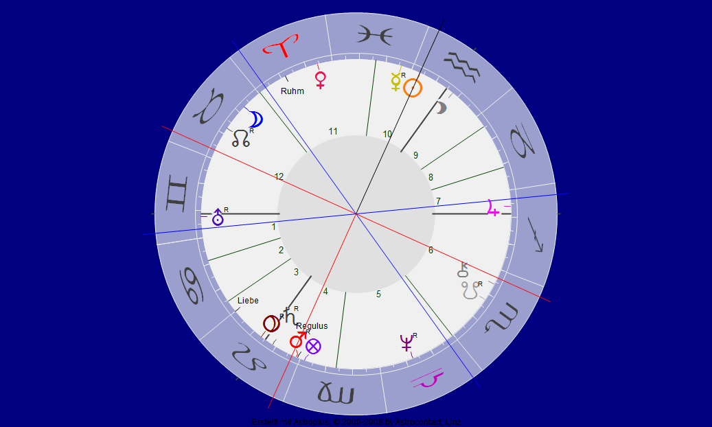 Der Zwillings-AC ergibt sich bei einer Urzeit von 12:00 Uhr Mittags, könnte aber durchaus passen. Denn uranisch (Uranus im Zwilling!), also befreiend, ist diese Persönlichkeit aus dem Zeichen des Heiligen Geistes: Wassermann. Der Wassermann, der sich vor die Leute stellt, und seine Botschaft gegen den Strom stellt – damit Energie erzeugend, denn dafür ist die Polarisierung notwendig. Wie so oft bei spirituellen Vorbildern, steht Jupiter stark im eigenen Zeichen, dem Schützen. Mond im Stier macht diesen Wassermann beliebt in der warmen Herde, Merkur rückläufig in den Fischen zwingt seine Zuhörer, einerseits genau zuzuhören, andererseits sich mit spirituellen Inhalten zu befassen. Venus im Widder will die Zuhörer erobern, Saturn/Pluto Mars im Löwen ist Siegen als karmische Kraft gewohnt (Und Versuchung der Macht als Verpflichtung), kann „ausflippen“; – Neptun in der Waage hat eine tiefe Sehnsucht nach Spiel und Kunst, Lilith im Sonnenzeichen ist ein geschickter Verführer – und doch – hat er nicht nur Recht, sondern steht einzigartig mit seiner Botschaft da: