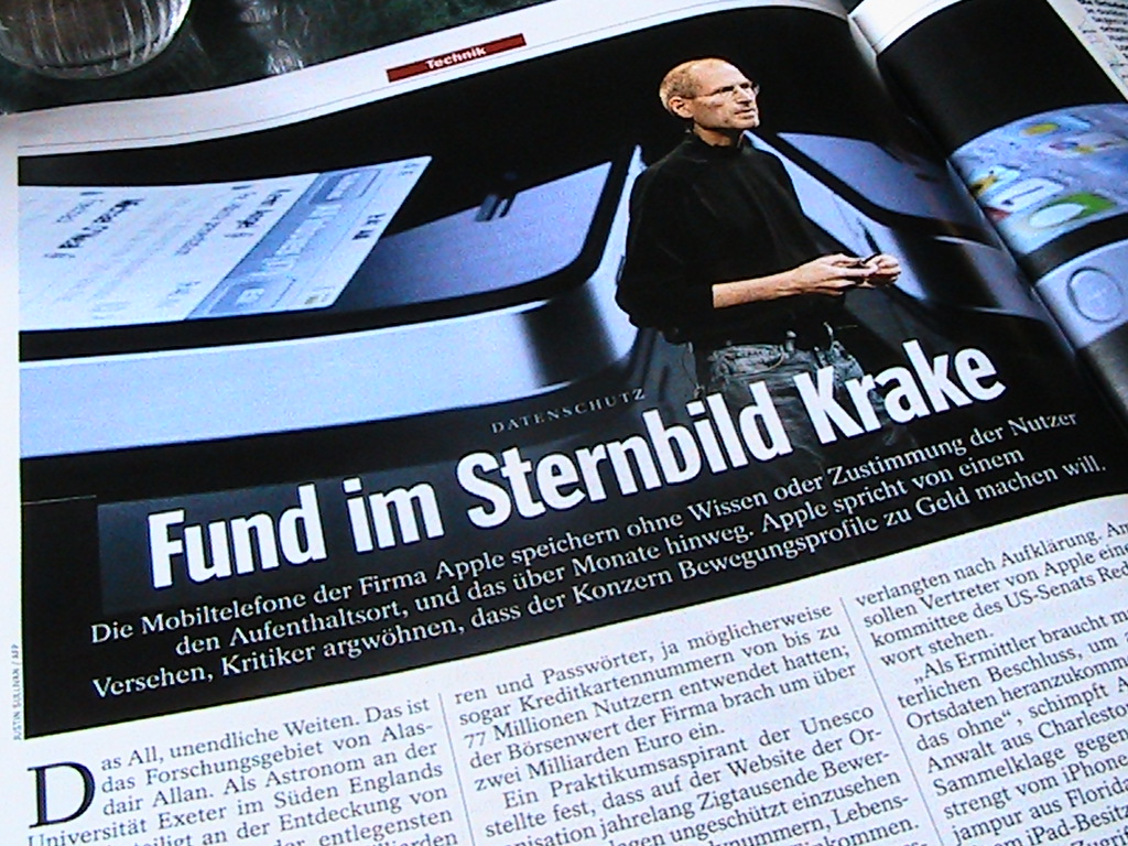das Image des Netzes wird fragwürdig. Ob die Autoren des Artikels wissen, daß Steve Jobs im Zeichen Fische geboren ist, und bewußt darauf ansprechen? Ob sie auch wissen, daß Neptun und Chiron in den Fischen stehen, dem Zeichen für´s Netz? Glaub ich eigentlich nicht. Vielleicht haben sie gehört, daß Jobs Joga macht und an geistigen Dingen Anteil nimmt. Aber bemerkenswerterweise führt der Artikel durch die story wieder in die Astronomie ein, ein Astronom deckt nämlich das äppelsche Inkognito wegen Datensammlungen von I-Phone-Trägern auf … Neptun passt sehr gut zur Unbegrenzheit des 12. Hauses und zum Netz, das in diesem Sinne grenzenlos ist. Ùnd nun erleben wir paralllel spektakuläre Sicherheits-Probleme, z.B. bei Sony und der Playstation und hier die kritische Offenbarung des Datensammlers „Big Brother“ Apple, also klar negative Manifestationen von Neptun und Chiron in den Fischen. Auch die Zahl der Geschädigten scheint riesig und im wahrsten Sinne des Wortes grenzenlos (12. Haus). Man verbeugt sich wieder, wie nach und immer noch Fukoshima. Das trübt die klare Sicht auf das noch gar nicht in ganzer Tragweite verstandene Tablet-Computer-Konzept. Apple täte gut daran, etwas europäischer zu denken.