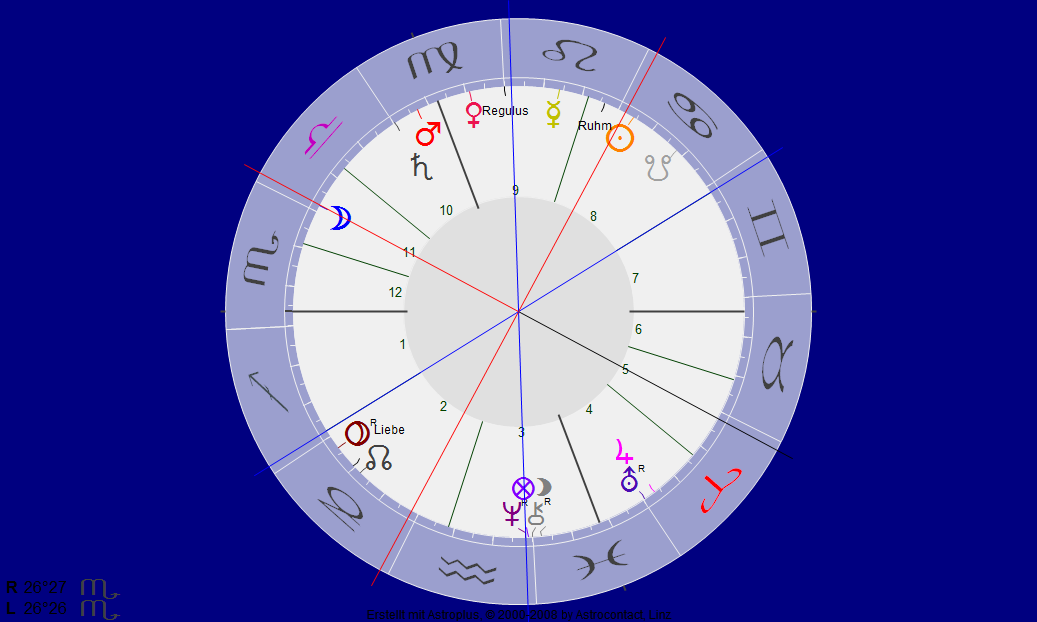 Im Horoskop sehen wir diese Neptun im Skorpion-Stellung mit Mond und Jupiter verstärkt. Mond könnte auch in der Waage oder zwischen Skorpion und Waage sein, aber das hypnotische seiner Erscheinung mit allem, Klang und Fülle, legt den Mond im Jupiter-Zeichen nahe …