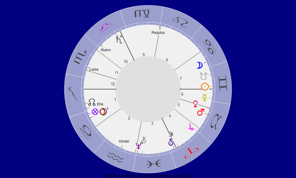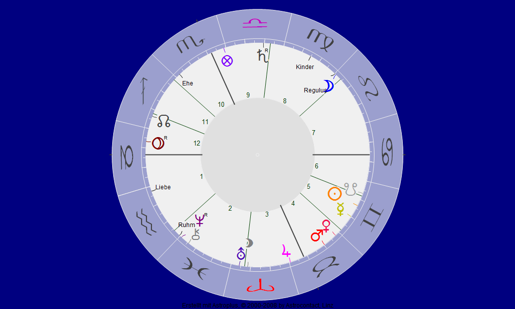 von ihm kennen wir die Geburtszeit nicht, aber wir sehen den Saturn über dem sonst verhandlungssicheren Mond/Lilith-„Verbund“ – also diplomatisch sein, verspielt, herzlich, aber zugleich bereit, vieles unkonventionell auszumachen, im Stil der großzügigen Geste, die in den oberen Rängen mit Charakter assoziiert wird, den Positionen zugeordnet, die alles organisieren lassen können, und daher Muße haben, wenn sie Muße anordnen.