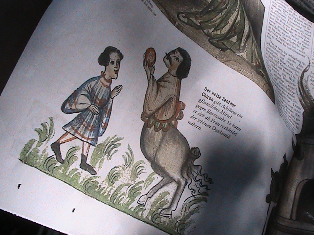 diese Allegorie zeigt Chiron als geheimen Boten der Liebe. Der Text ist lustig: Chiron, der Zentaur, gibt Achilleus „ein pflanzliches Mittel“ gegen Bartwuchs. Damit er sich als Frau verkleiden kann. Die Parabel von der Erkenntnis des hingebungsvollen Mannes und der eroberungsfreudigen Frau. Das Bild allerdings widerspricht dem Bildtext aus der Zeitung: trägt doch vorbildhaft der Zentaur Chiron einen ganz vorzüglichen Bart, und wie könnte wohl ein solcher ein Mittel gegen Bartwuchs preisen? Und das „pflanzliche Mittel“, was ist da wirklich auf dem Bild zu sehen?