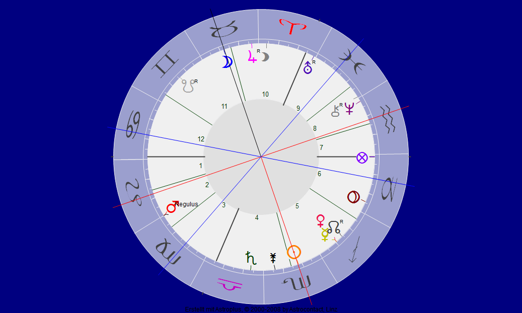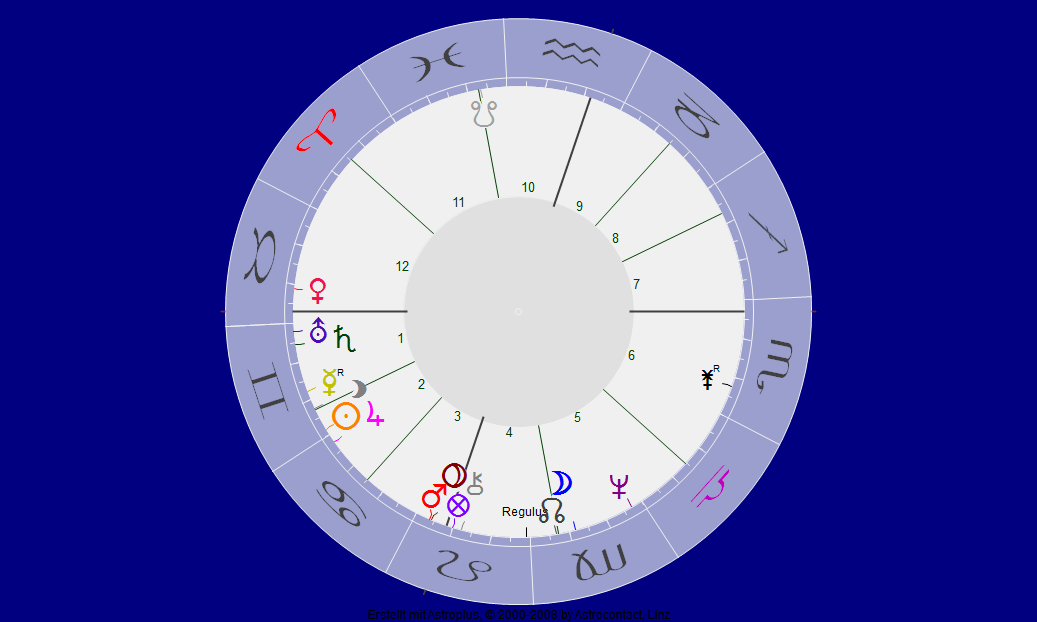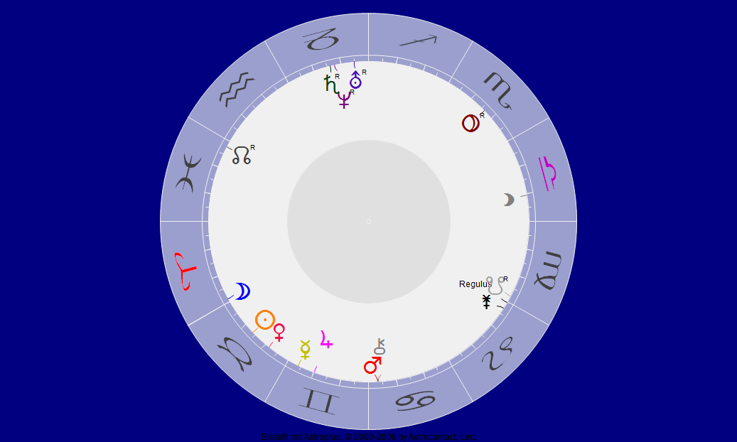 1 Zeichen gibt es: die Antiszie des Glückspunktes steht (man spiegelt den richtigen Glückspunkt nach der Tagformel an Null-Grad Steinbock) an der Spitze zu Haus 4.
