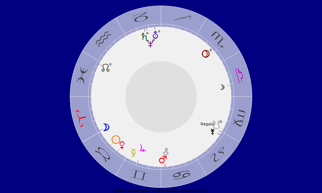 Ich gebe zu, das alles hört sich sehr anti-naturwissenschaftlich an; aber das bin ich gar nicht. Doch die Leutchen, mit denen wir es zu tun haben sind so sehr darauf erpicht, ihre dummdreiste Assistenz bei der technisch gestützten Welt- und Naturzerstörung als höhere Weisheit unters Volk zu bringen (in Wahrheit Milliarden und Abermillarden von Forschungsgeldern abzustauben, und zwar doppelt, wie die Banken: hinterher noch für die vermeintliche „Rettung“ kassieren), während sie gleichzeitig – jeden festen Boden und Maßstab selbst offenbar entbehrend (in Bezug darauf, was „Realität“ ist) uns (den seriösen Astrologen) meinen in kompletter Ignoranz die Leviten lesen zu können, daß man dieser Tage ein paar deutliche Worte zu viel sprechen darf, meine ich.