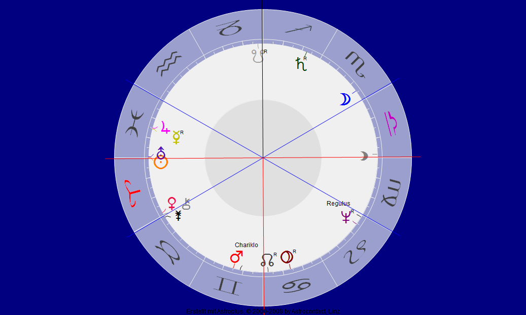 Auflösung: „Säge als Schwert“ = Mars in der Jungfrau, Thema Nützlichkeit – „Raubfisch“ = Chiron und Neptun Fische, außerdem Merkur = „Raub“, Gott des Diebstahls (auch); „zerteilt seine Beute“ = Opposition zwischen Mars in der Jungfrau und Chiron in den Fischen …