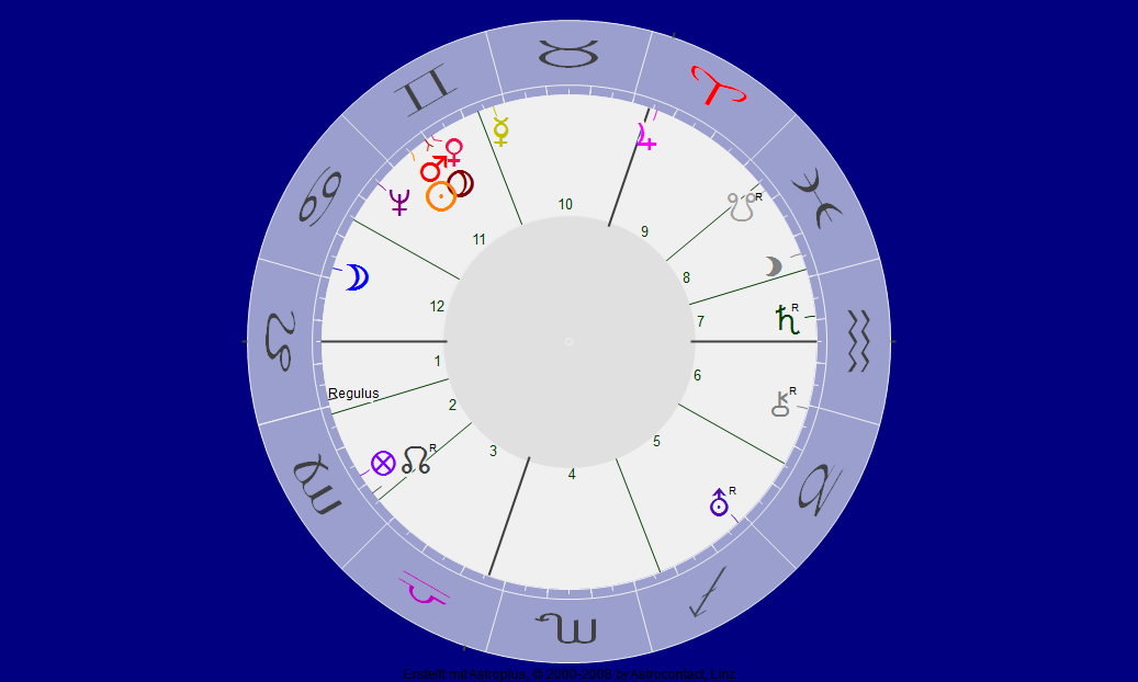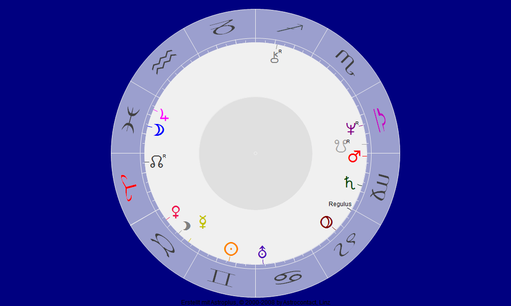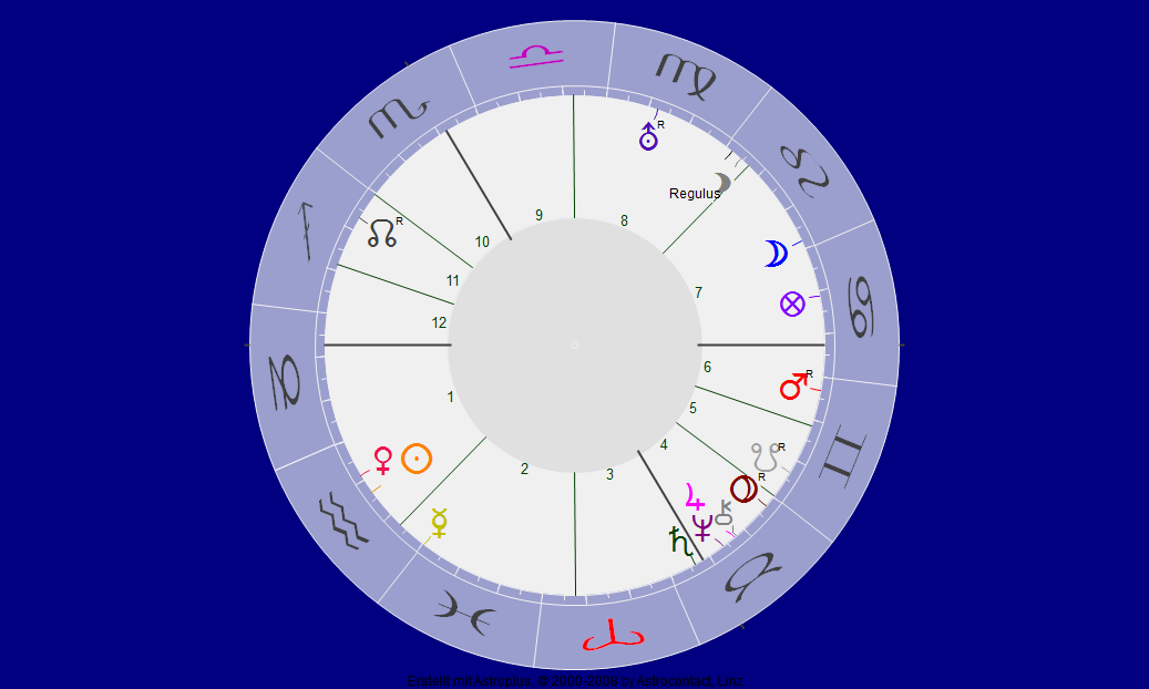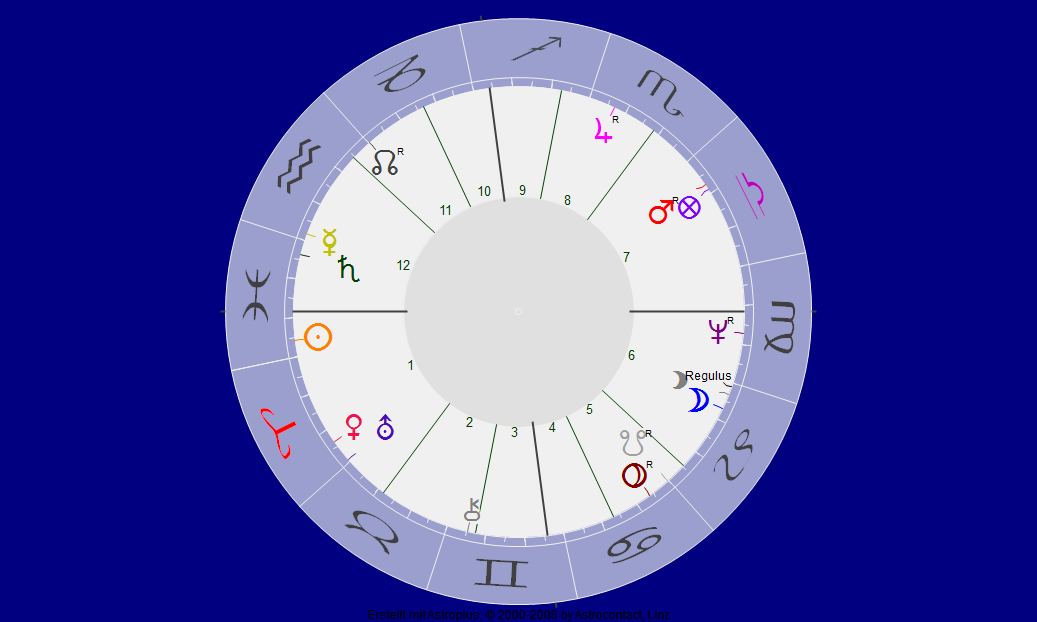 von Hans Wollschläger ist der Geburtszeitpunkt nicht bekannt, aber die Todeszeit kennen wir genau. Der Südknoten stand gradgenau über Neptun, dem Fische-Herrscher. Schon allein deswegen nehme ich an, daß Wollschläger ein Fische/Widder-Aszendent (und nicht nur Sonne war) – auch seine Augen (der „Aquarium-Blick“) sind ein Indiz dafür. Und natürlich Monika Wollschläger, denn sie ist Waage-Sonne und Aszendent – und passt so gut in Hans Wollschlägers Partnerhaus.