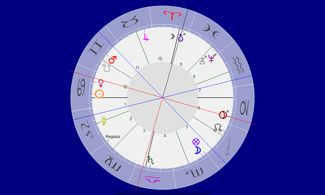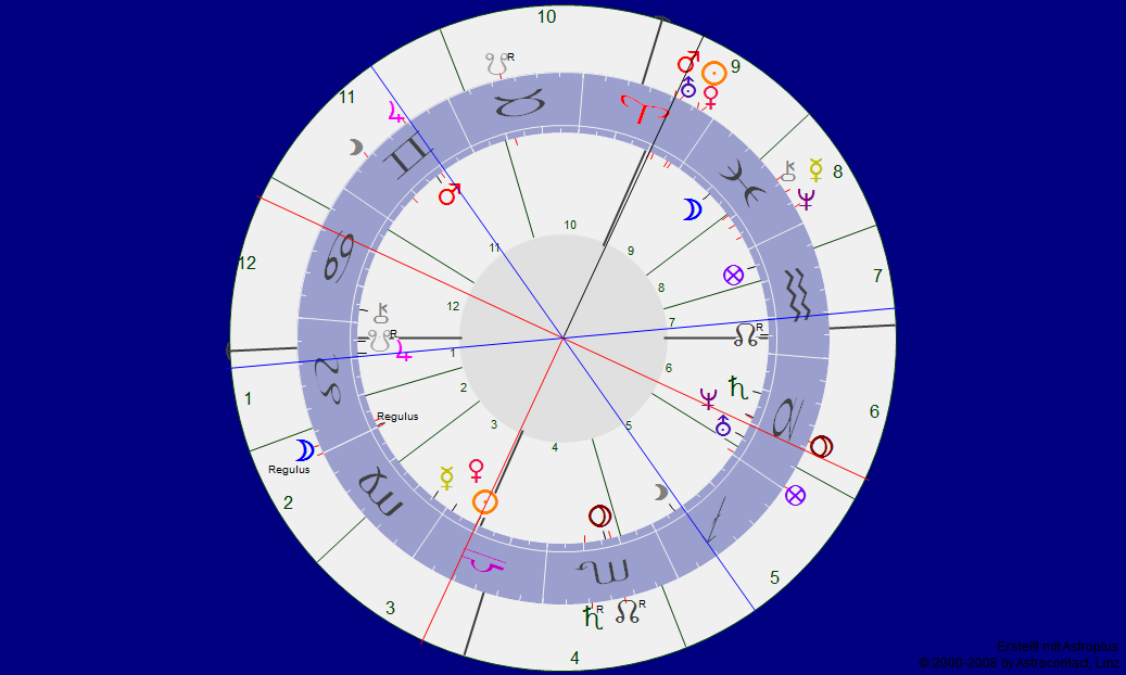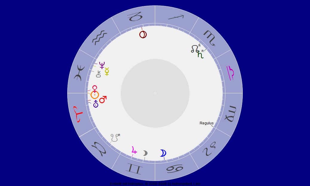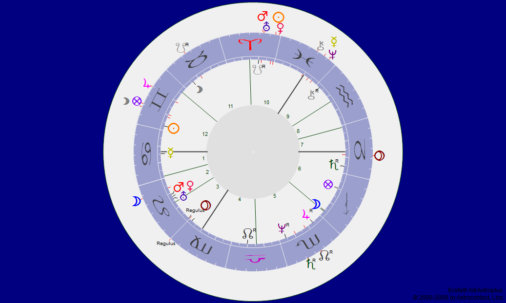 ich habe hier das Pluto-Uranus Quadrat eingestellt, weil wir uns – ebenso in kardinalen Zeichen – wieder in so einem Quadrat befinden. Bemerkenswert ist der rückläufige Merkur in Cazimi im Widder an der Spitze zu Haus 7 – Neptun mit Mars in der Jungfrau am Südknoten – das sind natürlich alles absolut bemerkenswerte Details – aber das „Signum“ des charts ist – wie so oft – Merkur.