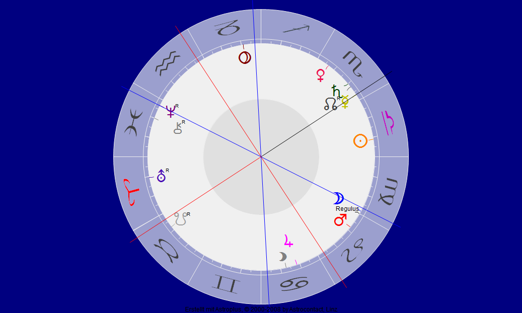 hier sieht man mit Jupiter in Haus 9 den berufenen Veröffentlicher … Uranus, Herr des 9. Hauses ist mit Merkur/Neptun praktisch und Schütze-mäßig in Haus 6, genau, wie die Steinbock-Sonne … Mars im Löwen (nur rückläufig) investiert von Haus 2 aus in die Häuser 11 und fünf, Gesellschaft und Kreativität. Imposant: Pluto/Saturn und Chiron in den Fischen in 10 – der Barrikadenkämpfer, der sicher auch plutonisches bewegt hat – im besten Sinn durch sein Wandlungsgedicht.