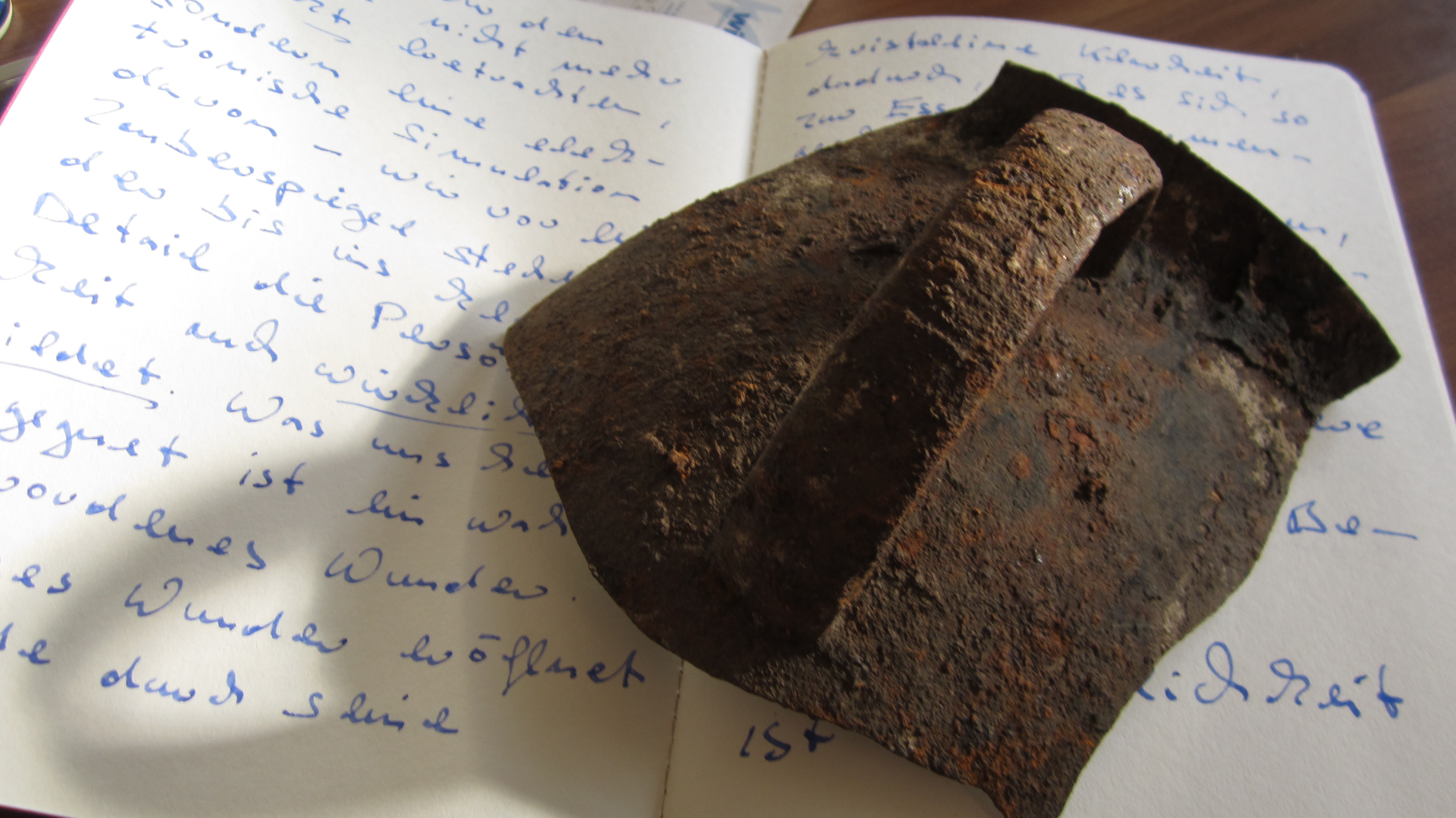 IMG_8280… den Henkel eines Kruges – vollständig Eisen – der das Sein, das er nicht mehr fasst in seiner hohlen Rundung doch umfasst als „Seyn“ im Geiste. Die Unterlage ist mein „work in progress“ … :-)