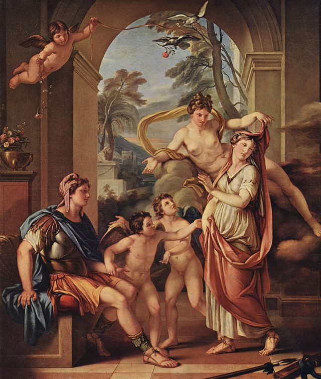 zwar verläßt Venus ihr Heimatzeichen Stier, doch dafür tritt sie trigonal zu Mars im Luftzeichen Waage. Da kann aus der Verbindung doch etwas werden, so um den 14. Juli herum, wenn auch der Mondknoten im exakten Trigon mitspielt … Aber zum schönen Bild oben machen alle Beteiligten ausnehmend blöde Gesichter: bis auf den netten Zwilling links, der den Helden Paris an der Hand nimmt, als wär´s sein eigenes inneres Kind. Venus in Zwillinge will ja nur spielen – doch solches Spiel wird Ernst, die Waffen unten rechts zeigen es auf …