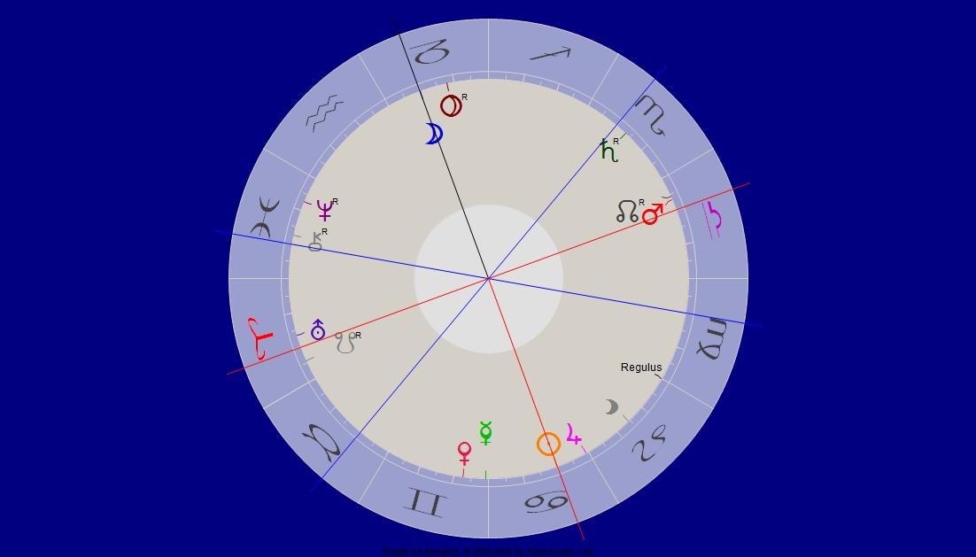 dieser Vollmond bringt – wird man/frau um diese Zeit geboren – leider doch „Gefühlstyrannen“ hervor, wie Oskar Adler – Astrowiki-de – der geniale, unbekannte und fast völlig vergessene Meister sagt. Mars hat gerade seine zweite Quadratur (die erste war im Januar im Steinbock, also dem Oppositions-Zeichen zu Krebs) zur Sonne hinter sich, und ebenso – noch wichtiger – die Sonne ihre Quadratur zu Uranus; – Merkur und Jupiter wechseln bald Zeichen. Und so wechselt auch bald die Stimmung: Merkur wird weniger umtriebig, aber mehr verbindlich (gefühlsmäßig); Jupiter wird weniger verbindlich, aber noch glücklicher (aber nur für diejenigen, die nicht Raketen und anderen Scheiß – excuse my language – brauchen.
