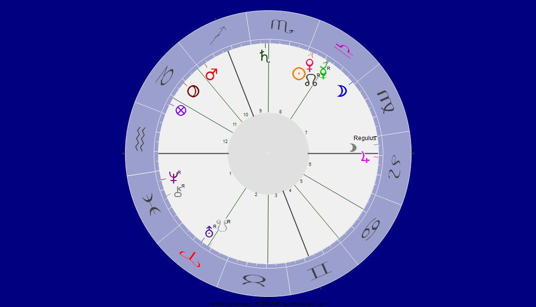 Merkur – wie wir im Bild sehen – steht mit dem Mondknoten genau zusammen – hier an der Spitze zum 8. Haus – dem Haus der Wandlung & Magie. Leiten tut aber Haus 10 im Zeichen Schütze, und es kommt eine starke Lösung mit Jupiter (und Lilith) am DC zustande – – ; – : das passt auch, denn Jupiter ist praktisch, Haus 6.