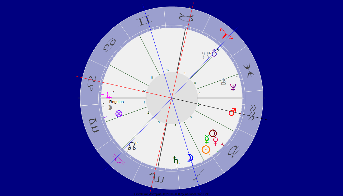 Venus ist Botschafterin der Bestimmung von Taurus (Haus 10) – doch die Bestimmung ist Wiedergeburt (Pluto) im Steinbock (die Materie selbst) mit Glück (auch Kindern, Haus 5); Kraft Venus-Pluto Konjunktion – es bündelt sich also vieles in der kreativen Tat (Löwe-Charakter des 5. Hauses)